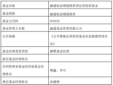中国经济网北京11月21日讯 今日,融通基金公告,孙健彬离任融通收益增强债券。 孙健彬2014年7月至2022年7月在中国民生银行股份有限公司工作,先后担任策略研究员、投资经理 等职务,2022年7月至2023年7月在民生理财有限责任公司工作,担任固定收益投资部投资经理。2023年 7月加入融通基金管理有限公司。 | 基金名称 | 融通收益增强债券型证券投资基金 | | --- | --- | | 基金简称 | 融通收益增强债券 | | 基金主代码 | 004025 | | 基金管理人名称 | 融通基金管理有限公司 | | 公告依据 | 《公开募集证券投资基金信息披露管理办 法》 | | 基金经理变更类型 | 解聘基金经理 | | 新任基金经理姓名 | | | 共同管理本基金的其他基金经 | 樊鑫、李可 | | 理姓名 | | | 离任基金经理姓名 | 孙健彬 | (责任编辑:康博) 融通收益增强债券A/C成立于2017年8月30日,截至2025年11月20日,其今年来收益率为8.42%、 8.03%,成立来收益率为43.66%、38.97%,累计净值为1.4008元、1.3607元。 ...