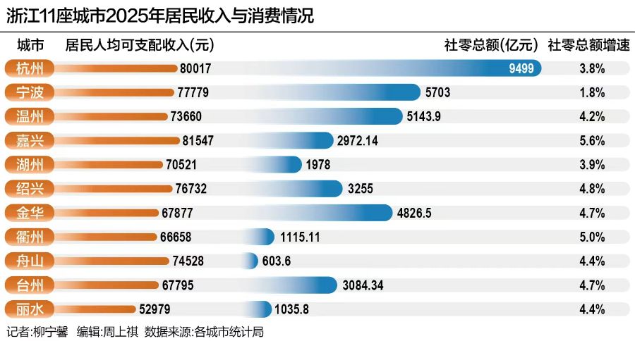 国家政策与宏观背景 - 近期,“增收”被列入国务院多个部门今年的工作重点,国家发展改革委表示正在研究制定稳岗扩容提质行动和城乡居民增收计划,以增强居民消费能力,优化消费供给 [1] - 2025年,全年内需对中国经济增长的贡献率超过67%,其中消费贡献率达到52%,内需已成为驱动转型升级的主动力 [13] 浙江省整体消费与收入概况 - 2025年,浙江省居民人均收入突破7万元,同期全国居民人均可支配收入为4.3万元,浙江“整体富”特征明显,除丽水外,10座城市居民人均收入在6.5万元以上 [4] - 浙江省内城市消费出现分化,高收入不等于高社会消费品零售总额增速,例如宁波居民人均收入全省前三,但社零增速垫底,而衢州、金华等浙西、浙中城市社零增速跑在前列 [4] - 从浙江实践看,提高居民收入是释放消费潜力的第一步,更关键的是形成收入增长、预期改善、消费释放的良性循环 [4] 嘉兴市消费与收入分析 - 2025年,嘉兴居民人均收入达到81547元,排在全省第一,全年社会消费品零售总额同比增长5.6%,增速居全省首位,呈现收入支撑强、消费动能足的特征 [5] - 嘉兴农村居民人均可支配收入为54939元,增长5.1%,增速高于城镇居民1.4个百分点,连续22年保持全省首位,全市城乡居民收入比值为1.48,为全省最优 [6] - 嘉兴消费亮点包括餐饮收入和乡村消费增速快于整体,线上消费和新型消费成为突出亮点,智能化、绿色化消费加快放量 [5] 杭州市消费与收入分析 - 2025年,杭州全市居民人均可支配收入突破8万元大关,达到80017元,同比增长4.2%,城乡居民收入倍差缩小至1.62 [7] - 杭州全市社会消费品零售总额达9499亿元,增长3.8%,其中体育娱乐用品类消费以45.3%的增速领跑,反映品质生活、健康消费需求释放 [7] 宁波市消费与收入分析 - 2025年,宁波居民人均可支配收入达77779元,实际增长3.6%,人均消费支出同比增长4.7%,但社会消费品零售总额仅增长1.8%,全省垫底 [7] - 从2025年1-11月数据看,宁波批发业、住宿业拖累明显,汽车类零售总额同比下降11.3%,消费回升更多来自结构性改善,而非总量拉动 [7] 浙西浙中城市消费新热点 - 2025年,衢州、金华、台州、绍兴等地社会消费品零售总额增速普遍较快,这些城市居民人均收入不领先,但生活成本较低、收入预期较好,消费供给优化 [8] - 以衢州为例,2025年社会消费品零售总额同比增长5.0%,限额以上单位网络零售额增长20.0%,化妆品、可穿戴智能设备、金银珠宝等品类增速居前 [8] - 城镇和农村居民人均可支配收入均保持接近5%的增长,农村增速略快于城镇,城乡收入差距进一步缩小 [8] 服务消费与新业态发展 - “演唱会经济”、“赛事经济”等消费热点出现,2025年浙江共举办大型演唱会212场、票房26.9亿元,带动综合消费超184亿元 [12] - 在温州,2025年“赛事+”、“演艺+”等文体旅融合发展带动限上住宿业、餐饮业营业额分别增长7.7%、14.1% [9] - 服务消费快速增长,浙江正着力培育服务消费供给,打造新场景、新业态,2025年绿色消费、智能化消费、大健康消费数量明显增加 [12] 未来消费潜力释放路径 - 专家认为下一步促消费需推进供给侧结构性改革,做好产品创新,并重点发展新业态、新模式、新场景,如文商旅融合、数字化创新 [14] - 2026年,人工智能是可预见的有望快速增长的应用场景类消费,城市有机更新建设消费新场景、特色商业门店发展、基于新农村的文旅空间也是增长点 [15] - 扩大消费需从根本上解决“能消费”与“敢消费”问题,包括健全终身技能培训制度,缓解群众在育儿、养老等方面的经济压力 [15]