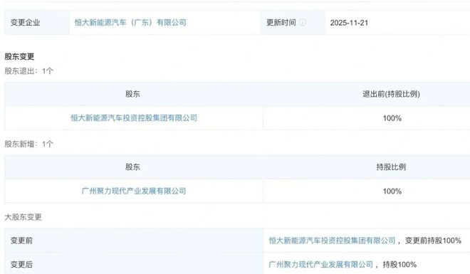更多最新消息: 外交部:请日方自重;商务部:望荷方就安世半导体问题尽快采取实际行动;泽连斯基已收到美和平 计划草案,将与特朗普通话磋商|早报 公开消息显示,近日,恒大智能汽车(广东)有限公司、恒大新能源汽车(广东)有限公司发生工商 变更,原股东恒大新能源汽车投资控股集团有限公司退出,新增广州国资旗下广州聚力现代产业发展 有限公司为全资股东。信息显示,恒大智能汽车(广东)有限公司成立于2018年,注册资本25亿 元,恒大新能源汽车(广东)有限公司成立于2019年,注册资本50亿元。 ...