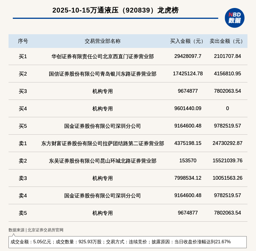 (记者 曾健辉) 免责声明:本文内容与数据仅供参考,不构成投资建议,使用前核实。据此操作,风险自担。 每经讯,2025年10月15日,北交所上市公司万通液压(920839,收盘价:58.9元)登上龙虎榜,交易方式是连续竞价,披露原因 是当日收盘价涨幅达到21.67%,成交数量925.93万股,成交金额5.05亿元。买一席位为华创证券有限责任公司北京西直门证券营 业部,买入2942.81万元;卖一席位为东方财富证券股份有限公司拉萨团结路第二证券营业部,卖出2473.03万元。 | | 2025-10-15万通液压(920839) 龙虎榜 | | | | --- | --- | --- | --- | | 序号 | 交易营业部名称 | 买入金额(元) | 卖出金额(元) | | नेट ग | 华创证券有限责任公司北京西直门证券营业部 | 29428097.7 | 2101707.84 | | 买2 | 国信证券股份有限公司青岛银川东路证券营业部 | 17425124.78 | 4156810.95 | | 买3 | 机构专用 | 9674877 | 7802063.54 | | 24 | 机构专用 | 9601 ...
