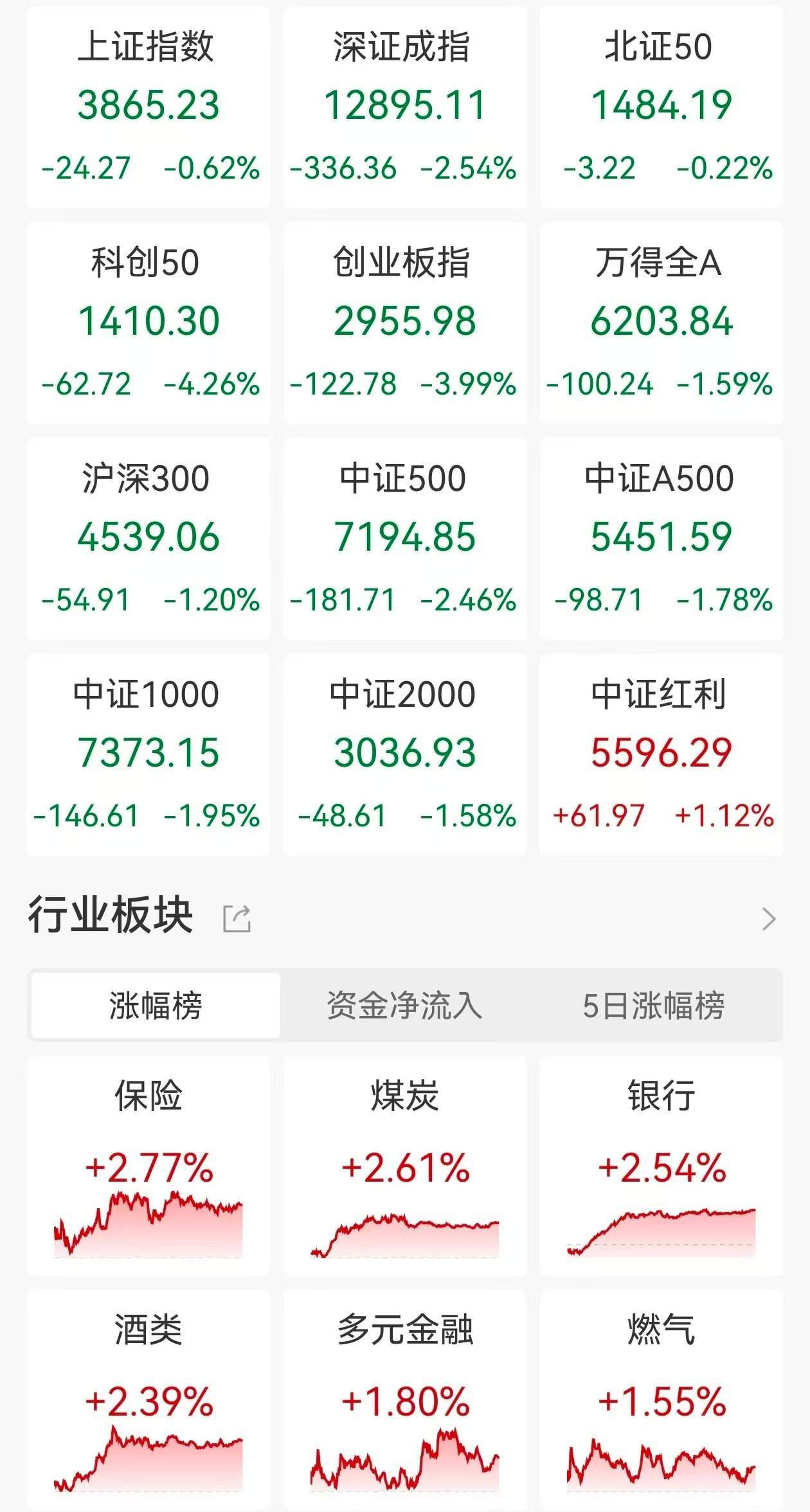 市场整体表现 - A股主要指数集体下挫,沪指跌0.62%报3865点,深证成指跌2.54%,创业板指跌3.99%,科创50指数跌4.26% [1] - 全市场成交额2.6万亿元,较前一交易日增量2224亿元 [1] - 超3500股下跌 [1] - 中证红利指数逆势上涨1.12% [2] 领跌板块与个股 - 半导体板块重挫,燕东微、芯源微等多股跌逾10% [3] - CPO概念、光通信模块股走低,通富微电跌停 [3] - 机器人板块集体大跌,上纬新材跌近15% [3] - 光刻机板块走弱,鼎龙股份领跌 [3] - AIPC、电子化学品、能源金属及激光雷达等板块跌幅居前 [3] 领涨板块与个股 - 培育钻石板块逆市走高,力量钻石20%涨停 [3] - 保险板块走高,新华保险涨超5% [3] - 燃气股拉升,佛燃能源、国新能源双双涨停 [3] - 行业板块涨幅榜显示保险板块上涨2.77%,煤炭板块上涨2.61%,银行板块上涨2.54% [2] - 酒类板块上涨2.39%,多元金融板块上涨1.80%,燃气板块上涨1.55% [2]