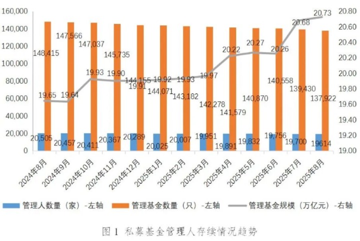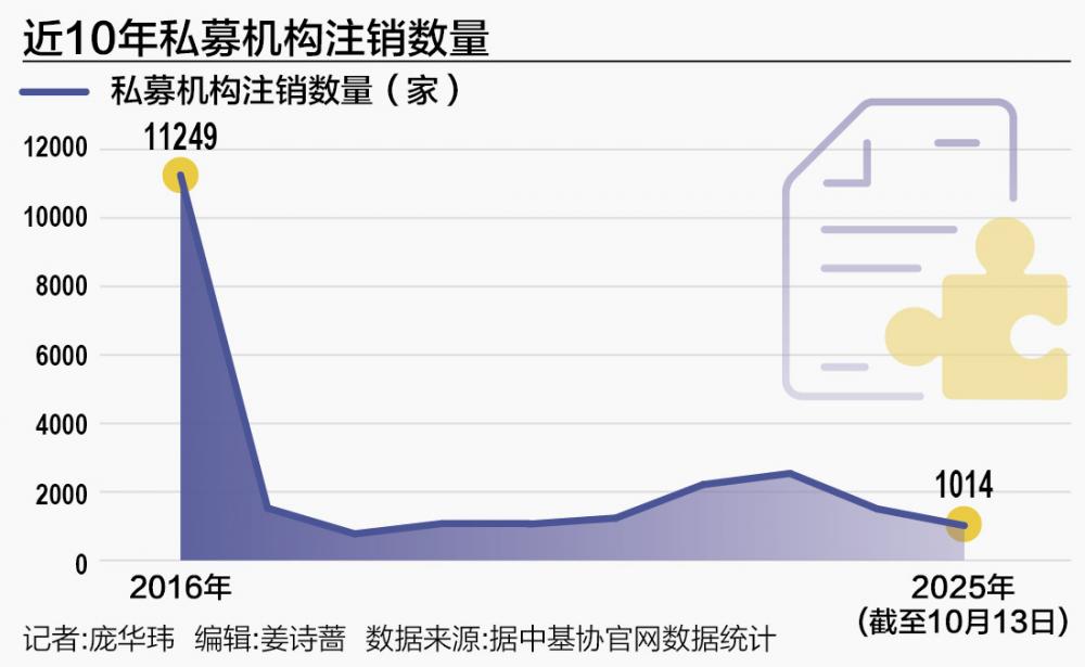 据中基协数据统计,年内又有逾千家私募管理人注销。而近10年来,已有超2.4万家私募管理人成为历 史。 这场始于2016年的行业大出清,已从政策驱动的"一次性清理",演变为监管与市场共同作用的常态 化"深度洗牌"。 目前来自中国证券投资基金业协会(以下简称"中基协")的最新数据显示,截至2025年8月末,存续私 募基金管理人19614家。其中,私募证券投资基金管理人7684家;私募股权、创业投资基金管理人11740 家;私募资产配置类基金管理人6家;其他私募投资基金管理人184家。 事实上,近10年私募基金管理人的数量在持续下降,这与基金行业的注销潮息息相关。 据中基协官网数据统计,截至10月13日,年内已注销私募基金管理人1014家,较去年同期1297家,减少 283家,降幅约22%。其中,"主动注销""协会注销""12个月无在管注销"以及"依公告注销"4种类型注销 数量分别为486家、454家、71家和3家。 而9月下旬,在国新办举行的"高质量完成'十四五'规划"系列主题新闻发布会上,中国证监会主席吴清 介绍,"私募基金风险整治扎实推进,约7000家僵尸机构完成出清,'伪私募'等增量风险基本得到遏 制。" ...