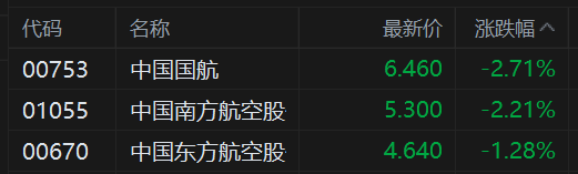 港股三大航空股集体走低,中国国航跌近3%