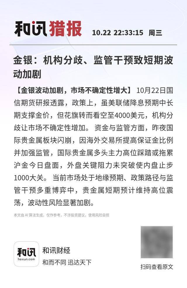和讯财经 和而不同 迅达天下 扫码查看原文 【金银波动加剧,市场不确定性增大】10月22日国信期货研报透露,政策上,虽美联储降息预期中长期 支撑金价,但花旗转而看空至4000美元,机构分歧让市场不确定性增加。 资金与监管方面,昨夜国际 贵金属板块闪崩,因海外交易所提高保证金比例并加强监管,国际贵金属多头主力高位踩踏或拖累沪金 今日盘面,外盘关键阻力未突破使内盘止步1000大关。 当前市场处于地缘预期、政策路径与监管干预 多重博弈中,贵金属短期预计维持高位震荡,波动性风险显著加剧。 本文由 AI 算法生成,仅作参考,不涉投资建议,使用风险自担 和讯猎报 10.22 22:33:15 周三 金银:机构分歧、监管干预致短期波 动加剧 【金银波动加剧,市场不确定性增大】 10月22日国 信期货研报透露,政策上,虽美联储降息预期中长 期支撑金价,但花旗转而看空至4000美元,机构分 歧让市场不确定性增加。资金与监管方面,昨夜国 际贵金属板块闪崩,因海外交易所提高保证金比例 并加强监管,国际贵金属多头主力高位踩踏或拖累 沪金今日盘面,外盘关键阻力未突破使内盘止步 1000大关。当前市场处于地缘预期、政策路径与监 管干预多 ...