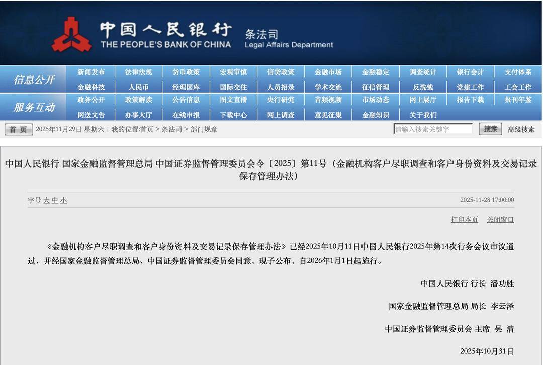 | 信息公开 | 新闻发布 | 法律法规 | 货币政策 | 宏观审慎 | 信贷政策 | 金融中议 | 金融稳定 | 调查统计 | 银行会计 | 支付体系 | | --- | --- | --- | --- | --- | --- | --- | --- | --- | --- | --- | | | 金融科技 | 人民币 | 经理国库 | 国际交往 | 人员招录 | 学术交流 | 征信管理 | 反洗钱 | 党建工作 | 工会工作 | | 服务互动 | 政务公开 | 政策解读 | 公告信息 | 图文直播 | 央行研究 | 音频视频 | 市场动态 | 网上展厅 | 报告下载 | 报刊年鉴 | | | 网送文告 | 办事大厅 | 在线申报 | 下载中心 | 网上调查 | 意见征集 | 金融知识 | 关于我们 | | | | | 首 页 2025年11月29日 星期六 我的位置:首页 > 条法司 > 部门规章 | | | | | | | 请输入搜索关键字 | 搜索 | 高级搜索 | 11月28日,中国人民银行官网发布《金融机构客户尽职调查和客户身份资料及交易记录保存管理办法》(下称《管理办法》),强调金融机构基于风险 ...