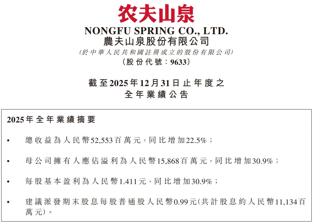 公司业绩表现 - 农夫山泉2025年全年总收益为人民币525.53亿元,同比增长22.5%,营收首次突破500亿元大关 [1][5] - 公司2025年毛利为318.08亿元,同比增长27.7% [1][5] - 2025年母公司拥有人应占溢利为158.68亿元,同比增长30.9% [1][5] 盈利能力与成本 - 公司毛利率由2024年同期的58.1%提升2.4个百分点至60.5% [1][5] - 毛利率提升主要因PET原材料采购价格下降,以及纸箱等包装物、白糖等原物料采购成本下降 [1][5] 渠道管理与股东回报 - 公司通过控制电商渠道销售占比,稳定了经销体系价格秩序,保障了经销体系整体盈利能力稳定和集团健康发展 [1][5] - 公司拟每股派发股息0.99元,合计派息约111.34亿元 [1][5] 市场反应 - 业绩公布后,农夫山泉(09633)早盘股价上涨逾10%,截至发稿时上涨9.90%,报46.64港元 [1][5] - 截至发稿时,公司股票成交额为2.18亿港元 [1][5]