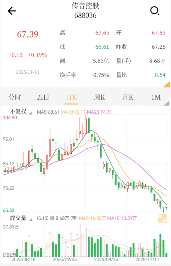 股价表现 - 公司股价自9月25日后连续下跌,27个交易日内累计跌幅接近35%,在科创50成分股中位列阶段跌幅首位,同期科创50指数跌幅仅约为6% [1] - 公司最新发布的三季报显示,2025年前三季度实现营收495.4亿元,同比下降3.33%,净利21.48亿元,同比下降44.97%,扣非净利17.31亿元,同比下降46.71% [3] - 第三季度单季实现营收204.66亿元,同比增长22.60%、环比增长27.33%,实现归母净利润9.35亿元,同比下滑11.06%、环比增长29.39% [3] 盈利能力与成本压力 - 公司三季报显示最新毛利率为19.47%,近年来首次跌破20%大关 [3] - 净利润大幅下滑归因于市场竞争以及供应链成本综合影响,导致营业收入及毛利额减少 [3] - 存储价格大幅上涨对公司经营形成压力,公司表示会通过提价、产品结构调整等措施应对,并根据成本变化和市场竞争动态调整以保持健康的毛利率水平 [4] 市场竞争格局 - 公司在非洲市场面临小米、OPPO、荣耀等国内手机品牌的激烈竞争 [4] - 今年二季度,小米集团在非洲手机市场的出货量同比大增32%,市场份额升至14%左右跃居第三,荣耀以4%的市场份额跃居第四 [4] - 传音在非洲的市场份额仍保持在50%以上,占据绝对优势 [4] 业务发展与未来潜力 - 公司在端侧AI方面积极布局,旗下TECNO AI和Infinix AI已广泛应用于影像增强、语音助手、AI写作等功能场景,并支持非洲、南亚本地部分小语种 [5] - 大众消费品牌itel的新品CITY100支持智能问答、实时翻译等实用AI服务,推动AI普及 [5] - 新兴市场国家仍处于功能机向智能机切换的发展趋势中,智能机渗透率相对较低,功能机换智能机是驱动市场增长的重要因素 [5] - 公司作为年出货量超1亿部的智能手机厂商,正积极与谷歌等伙伴合作推动实用型AI技术在新兴市场的创新与普及 [6][7] - 在移动互联网业务方面,公司与网易、腾讯等多家国内领先的互联网公司进行出海战略合作,开发和孵化移动互联网产品 [7] - 近1个月内共有9家券商就公司发布投资评级,其中6家券商给出买入评级,2家券商给出增持评级 [7]