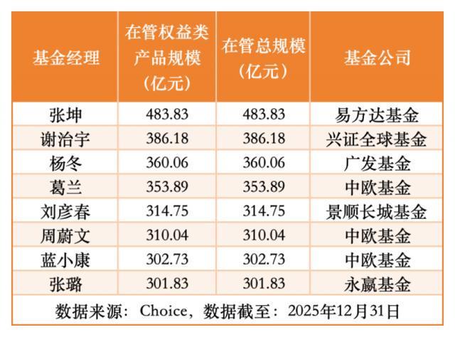 核心观点 - 截至2025年底,主动权益类基金管理规模呈现显著的头部集中特征,顶尖基金经理凭借长期业绩与市场认可度稳固领先地位,其中管理规模超过300亿元的基金经理共有8位 [1][2][3] - 头部基金公司展现出强大的平台优势,通过培育和留住顶尖投资人才形成显著的基金经理集群效应 [3][4] - 管理规模超过300亿元对基金经理的宏观视野、行业配置和流动性管理能力构成重大考验,其投资操作对市场有边际影响 [4][5] - 规模在200亿至300亿元区间的基金经理竞争激烈,他们是未来向头部进阶的主要后备力量,此规模是检验其策略扩展性和能否持续创造超额收益的关键阶段 [7][8] - 部分基金经理采用“多条腿走路”模式,管理总规模与权益类规模差异显著,这体现了基金行业向精细化、专业化分工发展的趋势,也对综合资产管理能力提出更高要求 [8][9] 基金经理规模排名 - **头部阵营(>300亿元)**:易方达基金张坤以483.83亿元位居榜首,兴证全球基金谢治宇以386.18亿元紧随其后,管理规模超过300亿元的还包括广发基金杨冬(360.06亿元)、中欧基金葛兰(353.89亿元)、景顺长城基金刘彦春(314.75亿元)、中欧基金周蔚文(310.04亿元)、中欧基金蓝小康(302.73亿元)和永赢基金张璐(301.83亿元)[1][2][3][6] - **中部阵营(200-300亿元)**:此区间竞争激烈,包括汇添富基金胡昕炜(286.82亿元)、易方达基金陈皓(279.83亿元)和萧楠(272.61亿元)、中欧基金赵磊(269.53亿元)、大成基金刘旭(265.33亿元)、广发基金刘格菘(249.91亿元)、富国基金朱少醒(224.84亿元)等众多基金经理 [6][7] - **规模差异案例**:部分基金经理在管总规模与权益类规模差异巨大,例如永赢基金高楠权益规模204.02亿元,总规模701.05亿元;景顺长城基金江山权益规模116亿元,总规模451.07亿元;景顺长城基金董晗权益规模86.75亿元,总规模623.82亿元 [6][8][9] 基金公司平台优势 - **中欧基金**:旗下葛兰、周蔚文、蓝小康三位基金经理权益管理规模均超过300亿元,赵磊与冯炉丹的规模也分别达到269.53亿元和206.14亿元,形成强大团队 [3][6] - **易方达基金**:除张坤外,陈皓、萧楠、刘健维、郑希的权益管理规模均在200亿元以上,形成显著的集群效应 [4][6] - **广发基金**:除杨冬外,刘格菘、李耀柱、陈韫中同样处于200亿至300亿元规模区间,团队整体实力均衡 [7] 行业趋势与模式 - **共同管理模式普及**:例如睿远基金的傅鹏博与朱璘共同管理睿远成长价值混合基金,二人基金规模均为210.87亿元;中欧医疗健康混合基金由葛兰与赵磊共同管理 [7] - **“多条腿走路”模式**:部分基金经理通过管理固收类或“固收+”等多元资产产品,实现总管理规模的跃升,这有助于平滑单一市场波动对规模的冲击,体现了行业精细化、专业化分工 [8][9] - **中部规模基金经理特点**:该群体基金经理往往对特定行业有深入钻研或具备较强的全市场选股能力,规模体量更为灵活,是向头部进阶的主要后备力量 [7][8]