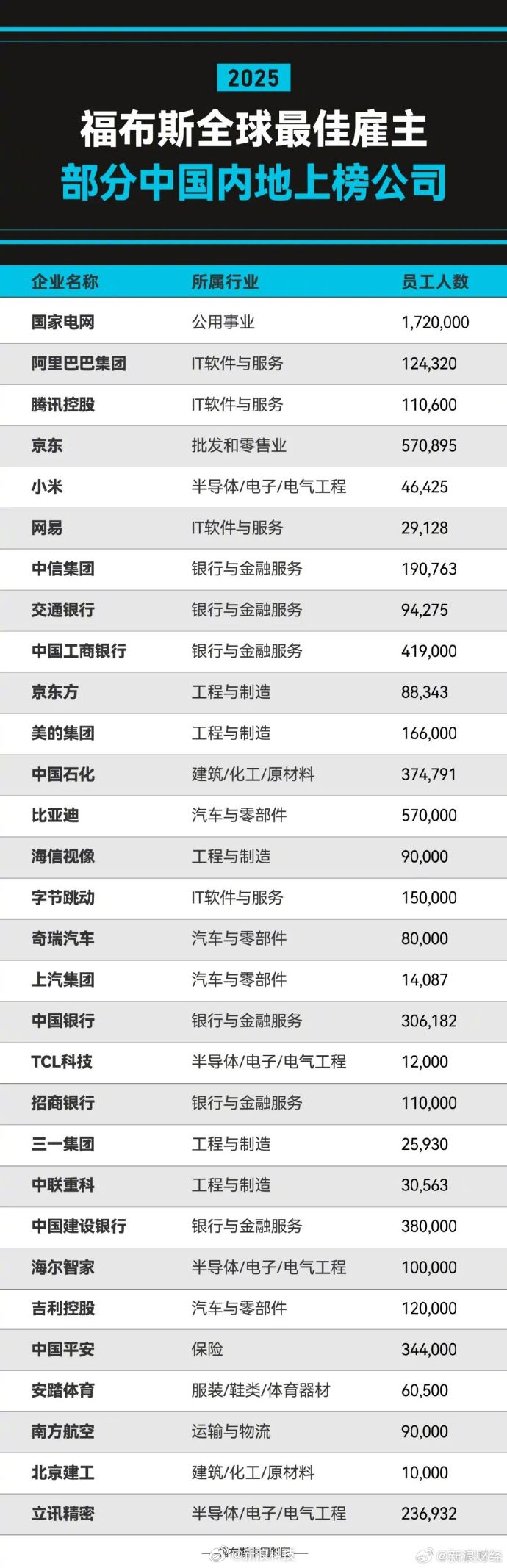 半导体/电子/电气工程 236,932 【#2025福布斯全球最佳雇主#】#微软连续两年蝉联全球最佳雇主榜首#今年一共有53家中国内地公司入 选福布斯全球最佳雇主榜单。在全球榜单前五名中有三家来自IT软件与服务行业,其中微软连续两年蝉 联榜首,谷歌母公司Alphabet位列第三,Adobe排名第四。(福布斯)#53家内地公司入选福布斯全球最 佳雇主# | 2025 | | | | --- | --- | --- | | 福布斯全球最佳雇主 | | | | 部分中国内地上榜公司 | | | | 企业名称 | 所属行业 | 员工人数 | | 国家电网 | 公用事业 | 1,720,000 | | 阿里巴巴集团 | IT软件与服务 | 124,320 | | 腾讯控股 | IT软件与服务 | 110,600 | | 京东 | 批发和零售业 | 570.895 | | 小米 | 半导体/电子/电气工程 | 46.425 | | 网易 | IT软件与服务 | 29,128 | | 中信集团 | 银行与金融服务 | 190,763 | | 交通银行 | 银行与金融服务 | 94.275 | | 中国工商银行 | 银行与金 ...