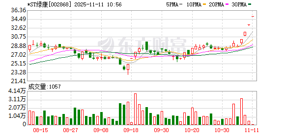 据天眼查APP显示,绿康生化股份有限公司成立于2003年06月13日,注册资本15541.5837万人民币。 (数据宝) *ST绿康盘中涨停,已连收4个涨停板,截至9:25,该股报35.02元,换手率0.04%,成交量6.10万股,成 交金额213.62万元,涨停板封单金额为2977.75万元。连续涨停期间,该股累计上涨21.56%,累计换手 率为3.25%。最新A股总市值达54.43亿元,A股流通市值53.95亿元。 龙虎榜数据显示,该股因连续三个交易日内,收盘价涨幅偏离值累计达到12%的ST证券、*ST证券上榜 龙虎榜1次,买卖居前营业部中,机构净买入240.67万元,营业部席位合计净卖出642.16万元。 公司发布的三季报数据显示,前三季公司共实现营业收入4.10亿元,同比下降13.21%,实现净利 润-8258.85万元,同比增长47.39%,基本每股收益为-0.5300元。 近日该股表现 | 日期 | 当日涨跌幅(%) | 换手率(%) | 主力资金净流入(万元) | | --- | --- | --- | --- | | 2025.11.10 | 5.01 | 0.34 | -36.69 | | ...