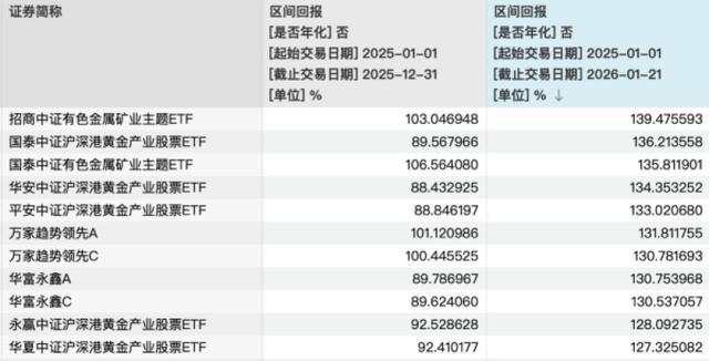 | 证券简称 | 区间回报 | 区间回报 | | | --- | --- | --- | --- | | | [是否年化] 否 | [是否年化] 否 | | | | [起始交易日期] 2025-01-01 | [起始交易日期] 2025-01-01 | | | | [截止交易日期] 2025-12-31 | [截止交易日期] 2026-01-21 | | | | [单位] % | [車位] % ↑ | | | 招商中证有色金属矿业主题ETF | 103.046948 | | 139.475593 | | 国泰中证沪深港黄金产业股票ETF | 89.567966 | | 136.213558 | | 国泰中证有色金属矿业主题ETF | 106.564080 | | 135.811901 | | 华安中证沪深港黄金产业股票ETF | 88.432925 | | 134.353252 | | 平安中证沪深港黄金产业股票ETF | 88.846197 | | 133.020680 | | 万家趋势领先A | 101.120986 | | 131.811755 | | 万家趋势领先C | 100.445525 | | ...