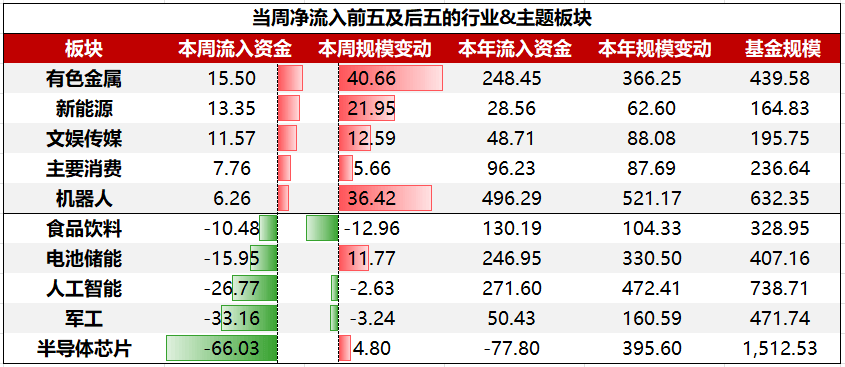 从大类来看,宽基&策略板块ETF净流入居前,达+506.71亿元,主要中证A500板块的流入;行业&主题板块ETF净流出居前,达-143.41亿元。 二、资金加减仓方向 具体到细分板块,宽基&策略板块ETF中,净流入前三大板块依次为:中证A500、策中证500、中证1000;净流出前三大板块依次为:沪深300、创业板、其 他宽基指数。 行业&主题板块ETF中,净流入前五大板块依次为:有色金属、新能源、文娱传媒、主要消费、机器人;净流出前五大板块依次为:半导体芯片、军工、人 工智能、电池储能、食品饮料。 一、全市场概况 截至上周末,全市场权益类ETF总规模50458.92亿元,过去一周场内总规模增加1437.22亿元,总份额增加276.32亿份,资金净流入401.66亿元。 | | | 当周净流入前五及后五的行业&主题板块 | | | | | --- | --- | --- | --- | --- | --- | | 板块 | 本周流入资金 | 本周规模变动 | 本年流入资金 | 本年规模变动 | 其余规模 | | 有色金属 | 15.50 | 40.66 | 248.45 | 366.25 | 439.58 ...