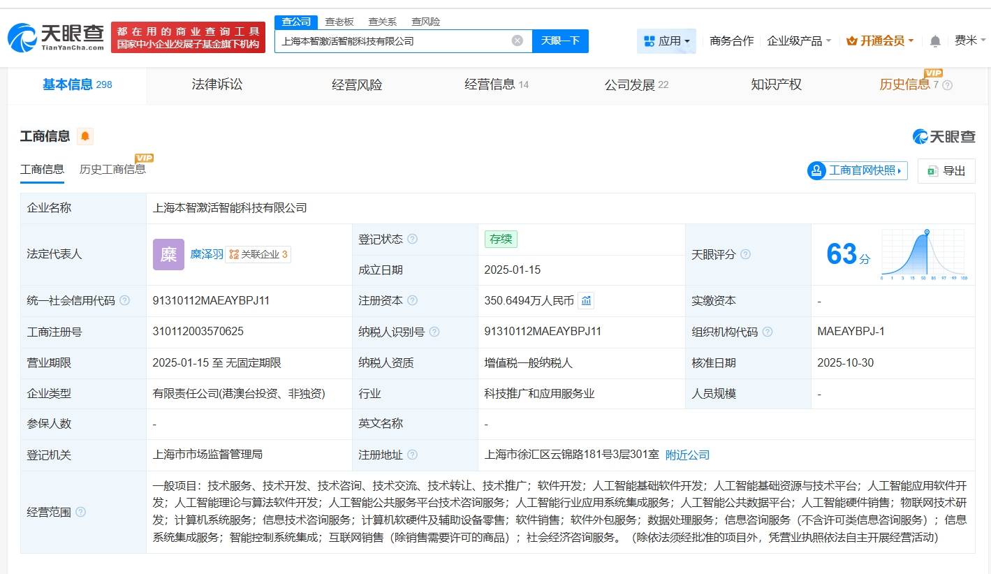 公司基本信息 - 公司全称为上海本智激活智能科技有限公司,成立于2025年1月15日,登记状态为存续 [2] - 公司法定代表人为糜泽羽,注册资本为350.6494万人民币,企业类型为有限责任公司(港澳台投资、非独资)[1][2] - 公司注册地址位于上海市徐汇区云锦路181号3层301室,行业属于科技推广和应用服务业 [2] - 公司经营范围包括人工智能基础软件开发、人工智能应用软件开发、技术服务和推广等 [2] 股权变更与股东结构 - 公司近期发生工商变更,新增百度旗下三亚百川致新私募股权投资基金合伙企业(有限合伙)和云飞四期有限公司等为股东 [1] - 公司注册资本由300万人民币增至约350.6万人民币,增幅约为16.87% [1] - 变更后,公司由上海爱派兹尔企业管理合伙企业(有限合伙)(持股41.858%)、糜泽羽(持股39.4197%)及新增股东等共同持股 [3] - 新增股东三亚百川致新私募股权投资基金合伙企业(有限合伙)持股比例为2.2222%,认缴出资额为7.7922万元 [3] 业务与技术定位 - 公司是一家专注于端侧原生AI技术研发与应用的企业 [1] - 具体业务涵盖人工智能基础资源与技术平台、人工智能理论与算法软件开发以及人工智能行业应用系统集成服务 [1][2]