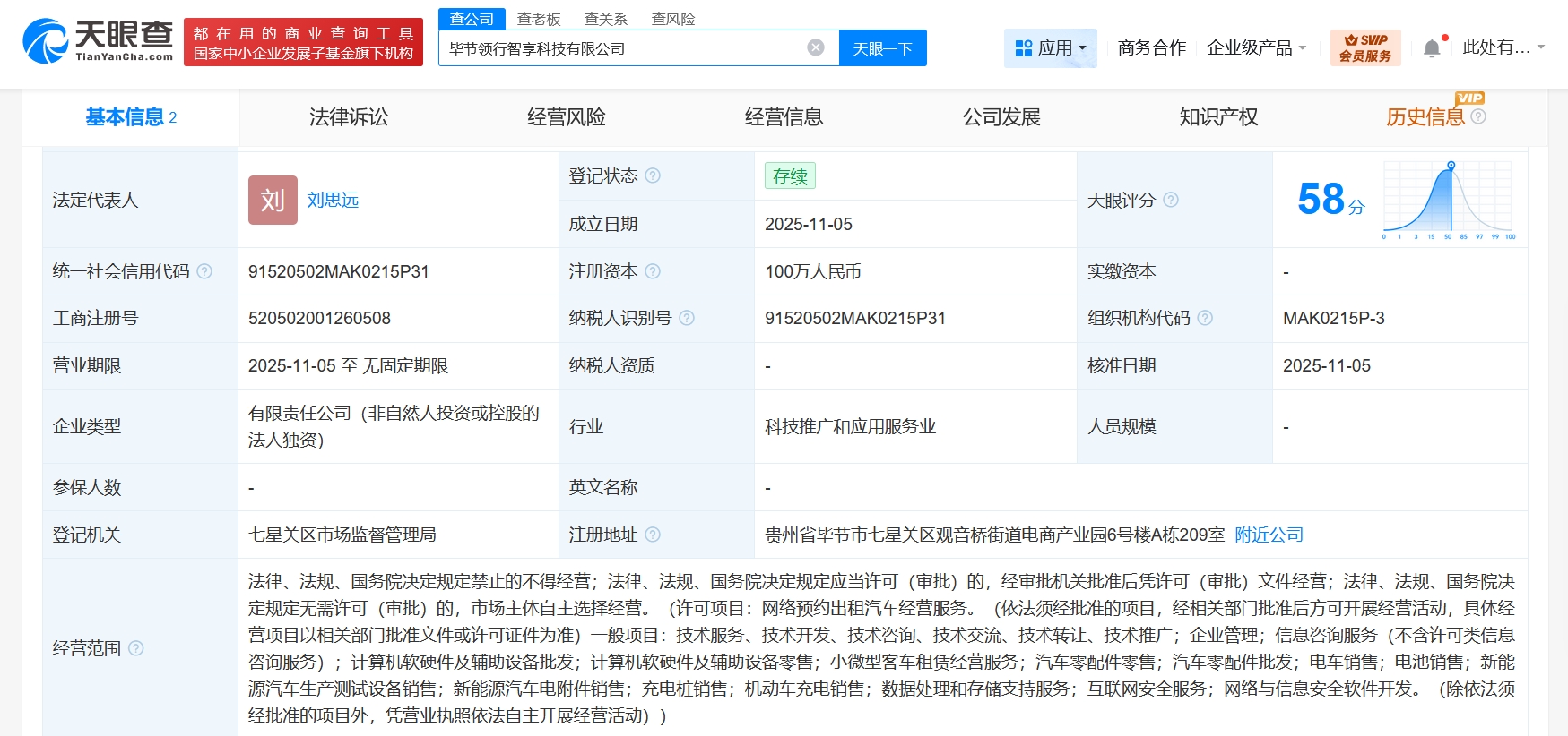 T3出行在贵州毕节成立智享科技公司 注册资本100万元