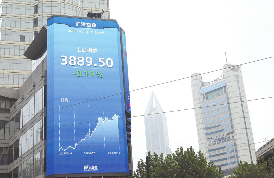 本周一(10月13日),A股市场三大指数低开高走,科创50指数低开近3%,午后翻红,收盘涨逾1%。截至收盘,沪指报3889.50点, 跌0.19%;深成指报13231.47点,跌0.93%;创指报3078.76点,跌1.11%。从盘面来看,稀土永磁、贵金属、金属新材料板块涨幅居 前,汽车零部件、短剧游戏、AI PC(智能电脑)板块跌幅居前。全市场近1700只股票收涨。沪深两市成交额2.35万亿元,较上一个交 易日缩量1609亿元。 回溯今年4月上旬"对等关税"冲击时的情形,不少券商都热衷于推荐有望受益于促内需的消费板块。据《每日经济新闻》记者观察,上 周末业内未重现此情形,券商的反应显得更为淡定。 每经记者|王海慜 王砚丹 每经编辑|彭水萍 上周大盘突破3900点后出现回踩,上周五,持仓密集、杠杆集中的科技主线出现大跌,引发指数调整;上周五晚间,受关税冲击再度 来袭影响,美股市场出现大幅调整,纳斯达克指数、标普500指数、纳斯达克金龙指数分别下跌3.56%、2.71%、6.10%。 视觉中国 有券商策略首席认为,A股行情演绎模式类似4月初,但幅度可能更低,脉冲式调整后不必悲观,预计今年四季度科技板块还有新高。 ...
