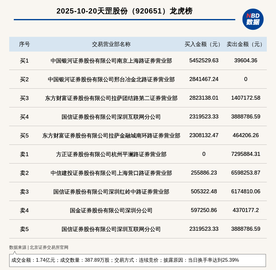 (记者 张明双) 免责声明:本文内容与数据仅供参考,不构成投资建议,使用前核实。据此操作,风险自担。 每日经济新闻 每经讯,2025年10月20日,北交所上市公司天罡股份(920651,收盘价:43.7元)登上龙虎榜,交易方式是连续竞价,披露原因 是当日换手率达到25.39%,成交数量387.89万股,成交金额1.74亿元。买一席位为中国银河证券股份有限公司南京上海路证券营 业部,买入545.25万元;卖一席位为方正证券股份有限公司杭州平澜路证券营业部,卖出729.59万元。 | | 2025-10-20天罡股份(920651) 龙虎榜 | | | | --- | --- | --- | --- | | 序号 | 交易营业部名称 | 买入金额(元) | 卖出金额(元) | | ポリ | 中国银河证券股份有限公司南京上海路证券营业部 | 5452529 63 | 39604.36 | | 买2 | 中国银河证券股份有限公司邢台冶金北路证券营业部 | 2841467.24 | 0 | | न्नें3 | 东方财富证券股份有限公司拉萨团结路第二证券营业部 | 2823138.01 | 1407172.58 | | ...
