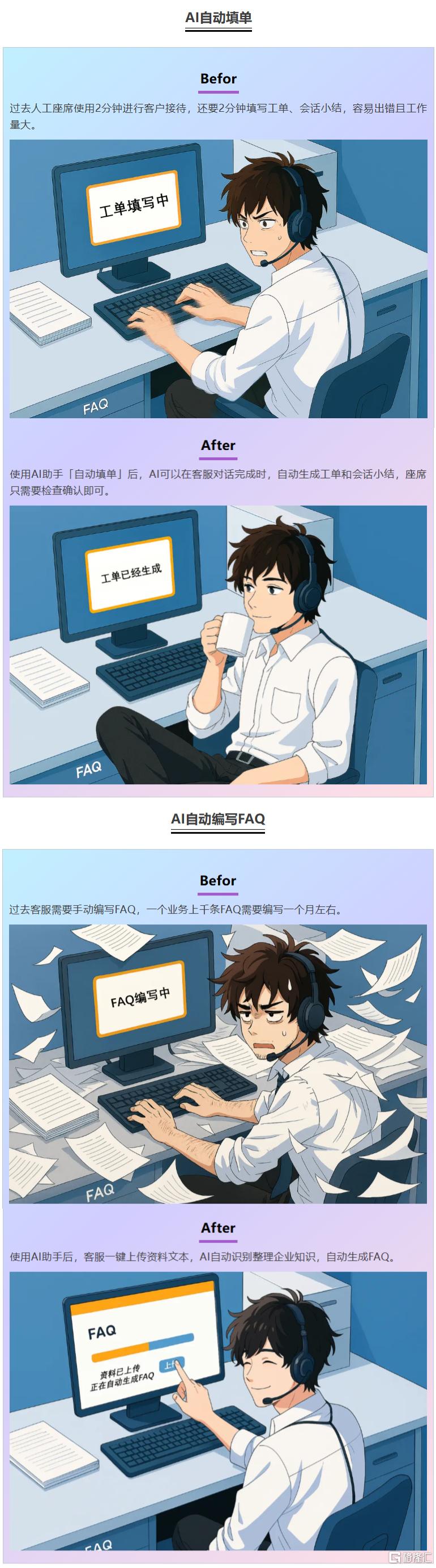 客服行业正在经历一场静悄悄的革命。 过去的客服岗位,意味着长时间机械劳动:不停填单、跨系统操作、死记硬背培训资料,甚至还要在客户的 抱怨和焦虑中疲于应付。高强度付出换来的,却是低效率和低满意度。更糟糕的是,客户早已被"机器人答非 所问、频繁转人工"的体验磨得失去耐心。 但今天,AI正在重塑这一切。 如果说过去的客服是"人力堆砌"的模式,那么新一代AI助手正在改写规则:自动生成工单、自动编写FAQ、 跨系统即刻调用、知识实时推荐、流程标准化引导……AI不仅让客服从"救火员"变成了"业务专家",更让客 户体验出现断层式提升。 这不再是"要不要用AI"的问题,而是"能否跟上AI驱动时代"的问题。企业如果继续依赖传统客服,意味着成 本高企、效率停滞、客户流失。而选择AI化,则意味着抢先迈入新增长曲线。 翻开这组漫画,你会发现——客服的未来,已经不属于昨天的模式。 使用AI助手「自动填单」后,Al可以在客服对话完成时,自动生成工单和会话小结,座席 只需要检查确认即可。 工单已经生成 FAQ AI自动编写FAQ Befor 传统文本机器人依赖FAQ,回答机械目问题覆盖有限,致客户频繁转人工。 Befor 过去客服需要手动 ...