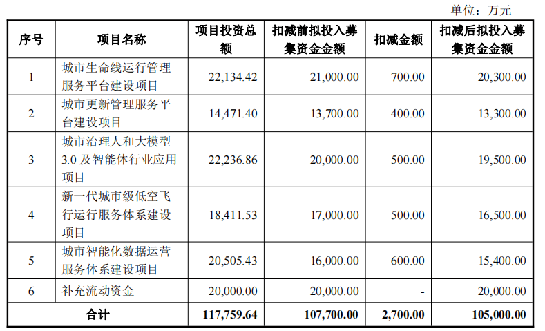 中国经济网北京10月16日讯 数字政通(300075.SZ)昨晚披露2025年度向特定对象发行A股股票预案称,本次向特定 对象发行股票拟募集资金总额不超过105,000.00万元(含本数)。根据相关规则,截至预案公告日,公司前次募集资金 中补充流动资金金额超出前次募集资金总额的30%,公司将超出部分于本次募集资金的总额中调减。调整前后具体投 入情况如下:城市生命线运行管理服务平台建设项目、城市更新管理服务平台建设项目、城市治理人和大模型3.0及智 能体行业应用项目、新一代城市级低空飞行运行服务体系建设项目、城市智能化数据运营服务体系建设项目、补充流 动资金。 | 序号 | 项目名称 | 项目投资总 额 | 扣减前拟投入募 集资金金额 | 扣减金额 | 扣减后拟投入募 集资金金额 | | --- | --- | --- | --- | --- | --- | | 1 | 城市生命线运行管理 | 22,134.42 | 21,000.00 | 700.00 | 20,300.00 | | | 服务平台建设项目 | | | | | | 2 | 城市更新管理服务平 | 14.471.40 | 13.700.00 | ...