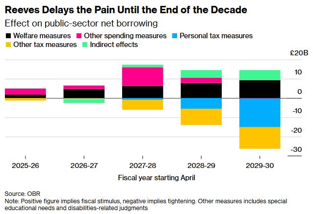智通财经APP获悉,英国财政大臣里夫斯(Rachel Reeves)周三公布的财政计划通过将大部分增税和支出 限制措施延后执行来实现整体账目的平衡。这意味着英国家庭和企业将从2028-29财年开始明显感受到 增税压力,并在次年承受高达260亿英镑(约合344亿美元)的财政紧缩。但与此同时,英国最迟必须在 2029年8月前举行下届大选。因此,在执政党工党民意支持率暴跌的背景下,标普全球评级和穆迪评级 均对里夫斯能否落实该计划提出质疑。 两家评级机构目前对英国主权债务均维持高质量评级且展望稳定。不过,穆迪指出"政策执行风险依然 高企",警告政府的部门支出计划"在选举年将难以实施"。英国政府目前预计各部门的实际日常支出在 2028-29和2029-30财年将仅增长0.5%,低于此前约1%的增速。 标普则对将主要紧缩措施推迟至五年财政计划的后期表示类似担忧,警告财政大臣可能被迫调整方针。 标普表示:"英国下届大选将于2029年举行,恰逢重大税收措施在2028年生效后不久。因此现政府有可 能随着投票日临近而选择撤回部分已公布的紧缩政策。" 本次预算案坚守了不提高个人所得税、国民保险和增值税主税率的竞选承诺,但通过多种" ...