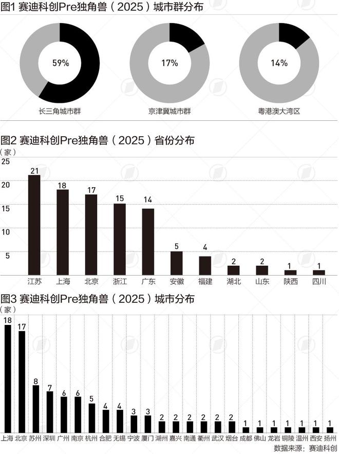 区域分布特征 报告显示,赛迪科创Pre独角兽(2025)区域集聚明显:长三角城市群有59家企业入围;京津冀城市群 17家企业,高度集聚在北京;粤港澳城市群入围企业14家,高度集聚在深圳、广州。三大城市群入围企 业合计占比达90%。 长三角城市群形成了区域内深度协同的"政、产、学、研、金"一体化生态赋能;京津冀城市群形成了以 北京为核心,河北、天津市积极承接北京溢出的科技创新项目的发展模式;粤港澳大湾区在培育Pre独 角兽方面打造了以"市场主导、产业驱动、跨境融合"为核心特征的创新生态系统。 从省份分布看,入围Pre独角兽企业数量居前五的省份分别是:江苏(21家)、上海(18家)、北京 (17家)、浙江(15家)、广东(14家)。 从城市分布看,赛迪科创Pre独角兽(2025)分布在24座城市,其中,上海、北京处于第一梯队;苏州 (8家)、深圳(7家)、广州(6家)、南京(6家)入围企业数量紧随其后。北京、上海、苏州、深圳 等多座城市已形成"产学研用""政府+高校+科技园"融合发展模式。 报告分析称,"Pre独角兽"估值尚未达到10亿美元,虽然目前不属于独角兽且未上市,但具备高成长 性,在3~5年内极有可能跃升 ...