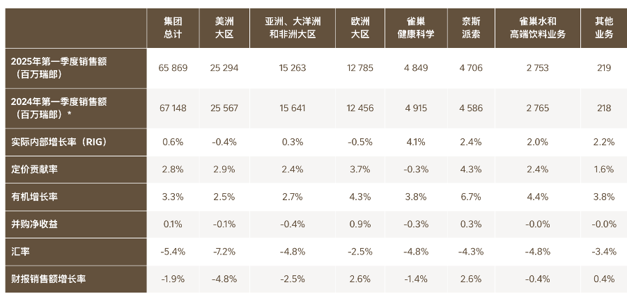 【导读】雀巢集团发布2025年前9个月财报,未来两年计划全球裁员约16000人 巨头,宣布裁员! 10月16日,雀巢集团发布2025年前9个月财报,当期销售额为658.7亿瑞士法郎,实际内部增长率为0.6%。 | | Total | Zone | Zone | Zone | Nestlé | Nespresso | Nestlé Waters & | Other | | --- | --- | --- | --- | --- | --- | --- | --- | --- | | | Group | Americas | AOA | Europe | Health | | Premium Beverages | businesses | | | | | | | Science | | | | | Sales 9M- | ୧୧ ୫୧୬ | 25 294 | 15 263 | 12 785 | 4 849 | 4 706 | 2 753 | 219 | | 2025 (CHF m) | | | | | | | | | | Sales 9M- | 67 148 | 26 567 | 15 641 | 12 456 ...