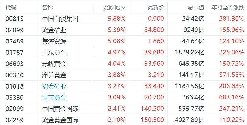 相关事件 金价新高不断,港股市场黄金股集体高开。其中,中国白银集团、紫金矿业、集海资源涨超5%,山东 黄金、赤峰黄金涨超4%,潼关黄金、招金矿业、灵宝黄金涨超3%,中国黄金国际、紫金黄金国际涨超 2%。消息面上,现货黄金盘中一度升破4380美元/盎司,再创历史新高。现货黄金年内累涨超65%。 | 代码 | 名称 | 涨跌幅 √ | 最新价 | 总市值 | 年初至今涨跌 | | --- | --- | --- | --- | --- | --- | | 00815 | 中国白银集团 | 5.88% | 0.900 | 24.42 7, | 281.36% | | 02899 | 案等处,不 | 5.39% | 34.800 | 9249 Z | 155.96% | | 02489 | 集海资源 | 5.08% | 1.860 | 44.64 7, | 124.10% | | 01787 | 山东黄金 | 4.97% | 39.680 | 1829.22亿 | 225.06% | | 06693 | 赤峰黄金 | 4.04% | 33.960 | 645.38 Z | 150.72% | | 00340 | 滝井 ...