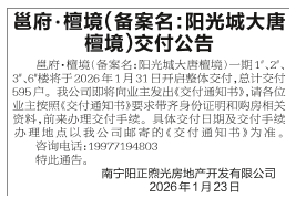 项目交付通告 - 南宁阳正煦光房地产开发有限公司发布关于“邕府 · 檀境”(备案名:阳光城大唐)项目的交付通告 [1] - 项目涉及595户住宅单位,公司即将向业主发出《交付通知书》 [1] - 业主需根据通知书要求,携带身份证明及购房相关资料办理交付手续 [1] - 具体交付日期及办理地点以公司邮寄的《交付通知书》为准 [1] - 公司提供了项目交付的咨询电话:19977194803 [1] - 通告发布日期为2026年1月23日 [1]