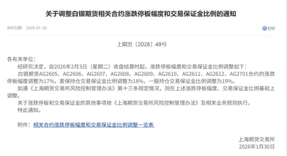 全球贵金属市场风险管理措施 - 全球贵金属市场经历剧烈波动,芝加哥商品交易所与上海期货交易所相继出台新规,通过上调保证金及涨跌停板幅度等措施强化市场风险管理 [1] 芝加哥商品交易所保证金调整 - 芝商所宣布自下周一收盘后,全面上调Comex黄金、白银期货的保证金要求 [2] - 黄金期货合约中,非高风险等级保证金从6%提高至8%,高风险等级保证金从6.6%提高至8.8% [2] - 白银期货合约调整幅度更大,非高风险等级保证金从11%提高至15%,高风险等级保证金从12.1%提高至16.5% [2] - 铂金和钯金期货合约的保证金也将同步提高 [2] - 芝商所表示此次调整是针对市场波动进行的“常规审查”结果,旨在确保抵押品覆盖充足,维护市场稳定运行 [2] - 保证金上调意味着投资者需缴纳更多资金以确保履约能力,可能对资金量较小的参与者形成挤压 [2] - 部分投资者可能因无法及时追加保证金而被迫平仓,进一步加剧市场波动 [2] - 本周早些时候,在贵金属价格快速上涨后,芝商所已上调过白银、铂金和钯金期货的保证金要求,显示出其对市场风险的高度警惕 [2] 上海期货交易所规则调整 - 上海期货交易所宣布自2026年2月3日收盘结算时起,对白银期货部分合约的涨跌停板幅度和交易保证金比例进行调整 [3] - AG2605至AG2701等合约的涨跌停板幅度从16%扩大至17% [3] - 套保持仓交易保证金比例从17%提高至18%,一般持仓交易保证金比例从18%提高至19% [3] - 业内人士分析,上期所此次调整旨在应对近期白银市场波动加剧的局面,通过提高交易成本、限制价格波动范围,防范过度投机行为,保护投资者利益 [5] - 近期全球贵金属市场受多重因素影响,价格波动频繁,交易所及时出台风险管控措施,有助于稳定市场预期,促进市场健康发展 [5]