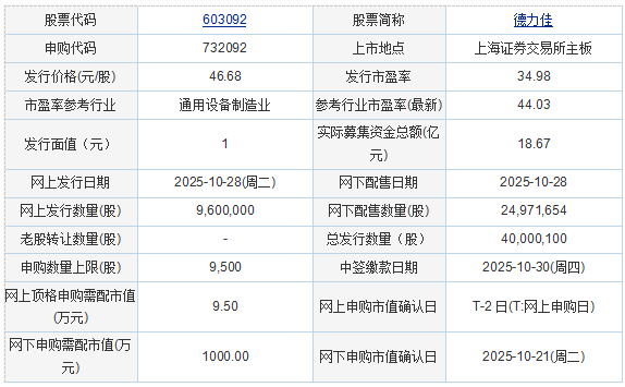 德力佳传动科技(江苏)股份有限公司核心发行信息 - 公司股票代码为603092,申购代码为732092,在上海证券交易所主板上市 [1] - 发行价格为每股46.68元,发行市盈率为34.98倍,低于参考行业市盈率44.03倍 [1] - 本次发行总数量为40,000,100股,其中网上发行9,600,000股,网下配售24,971,654股 [1] - 预计募集资金总额为186,720.4668万元,扣除发行费用后募集资金净额为177,425.74万元 [3] - 实际募集资金总额为18.67亿元,超过拟募资额188,080.00万元 [1][2] 德力佳公司业务与股权结构 - 公司主营业务为高速重载精密齿轮传动产品的研发、生产与销售,核心产品是风电主齿轮箱 [2] - 控股股东为南京晨瑞,直接持有公司30.53%的股份 [2] - 实际控制人为刘建国与孔金凤夫妇,二人合计控制公司41.98%的股份 [2] - 募集资金将用于年产1000台8MW以上大型陆上风电齿轮箱项目及年产800台大型海上风电齿轮箱汕头项目 [2] 中诚智信工程咨询集团股份有限公司核心发行信息 - 公司股票代码为920003,在北京证券交易所上市,发行采用直接定价方式 [4][5] - 发行价格为每股14.27元,发行市盈率为9.69倍 [5] - 本次发行总数量为1400.00万股,其中网上发行1260.00万股 [5] - 预计募集资金总额为19,978.00万元,扣除发行费用后募集资金净额为17,316.40万元 [7] - 拟募资金额为19,989.52万元,实际募集资金总额略低于拟募资额 [6][7] 中诚咨询公司业务与股权结构 - 公司主营业务为工程造价、招标代理、工程监理及管理、BIM服务、工程设计等专业技术服务 [6] - 公司成立于2002年1月,曾于2016年12月在全国股转系统挂牌,2023年5月进入创新层 [6] - 实际控制人为陆俊、许学雷夫妇,许学雷合计支配公司86.98%的表决权 [6] - 募集资金将用于工程咨询服务网络建设项目和研发及信息化建设项目 [6]