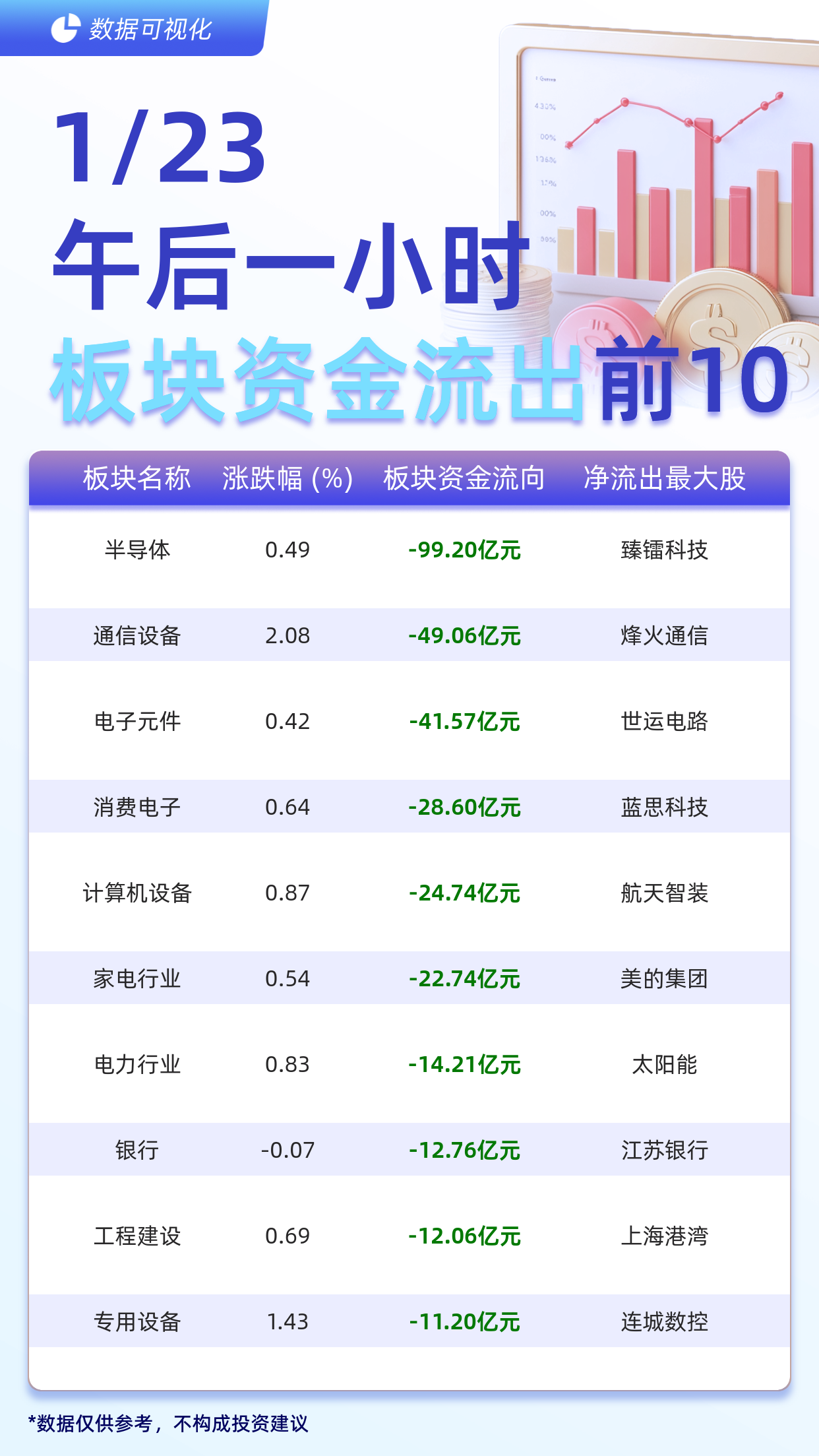 大盘主力资金流向 - 截至1月23日午后一小时,大盘主力资金净流出145.05亿元 [1] 主力资金净流出前十大板块 - 半导体板块净流出99.20亿元,为流出最多的板块,该板块当日涨跌幅为0.49% [1][2] - 通信设备板块净流出49.06亿元,该板块当日涨跌幅为2.08% [1][2] - 电子元件板块净流出41.57亿元,该板块当日涨跌幅为0.42% [1][2] - 消费电子板块净流出28.60亿元,该板块当日涨跌幅为0.64% [1][2] - 计算机设备板块净流出24.74亿元,该板块当日涨跌幅为0.87% [1][2] - 家电行业板块净流出22.74亿元 [1] - 电力行业板块净流出14.21亿元,该板块当日涨跌幅为0.83% [1][3] - 银行板块净流出12.76亿元,该板块当日涨跌幅为-0.07% [1][3] - 工程建设板块净流出12.06亿元,该板块当日涨跌幅为0.69% [1][3] - 专用设备板块净流出11.20亿元,该板块当日涨跌幅为1.43% [1][3] 各板块中净流出最大的公司 - 半导体板块中,臻雷科技为净流出最大的公司 [2] - 通信设备板块中,烽火通信为净流出最大的公司 [2] - 电子元件板块中,世运电路为净流出最大的公司 [2] - 消费电子板块中,蓝思科技为净流出最大的公司 [2] - 计算机设备板块中,航天智装为净流出最大的公司 [2] - 电力行业板块中,太阳能为净流出最大的公司 [3] - 银行板块中,江苏银行为净流出最大的公司 [3] - 工程建设板块中,一次换澳门为净流出最大的公司 [3] - 专用设备板块中,连城数控为净流出最大的公司 [3]