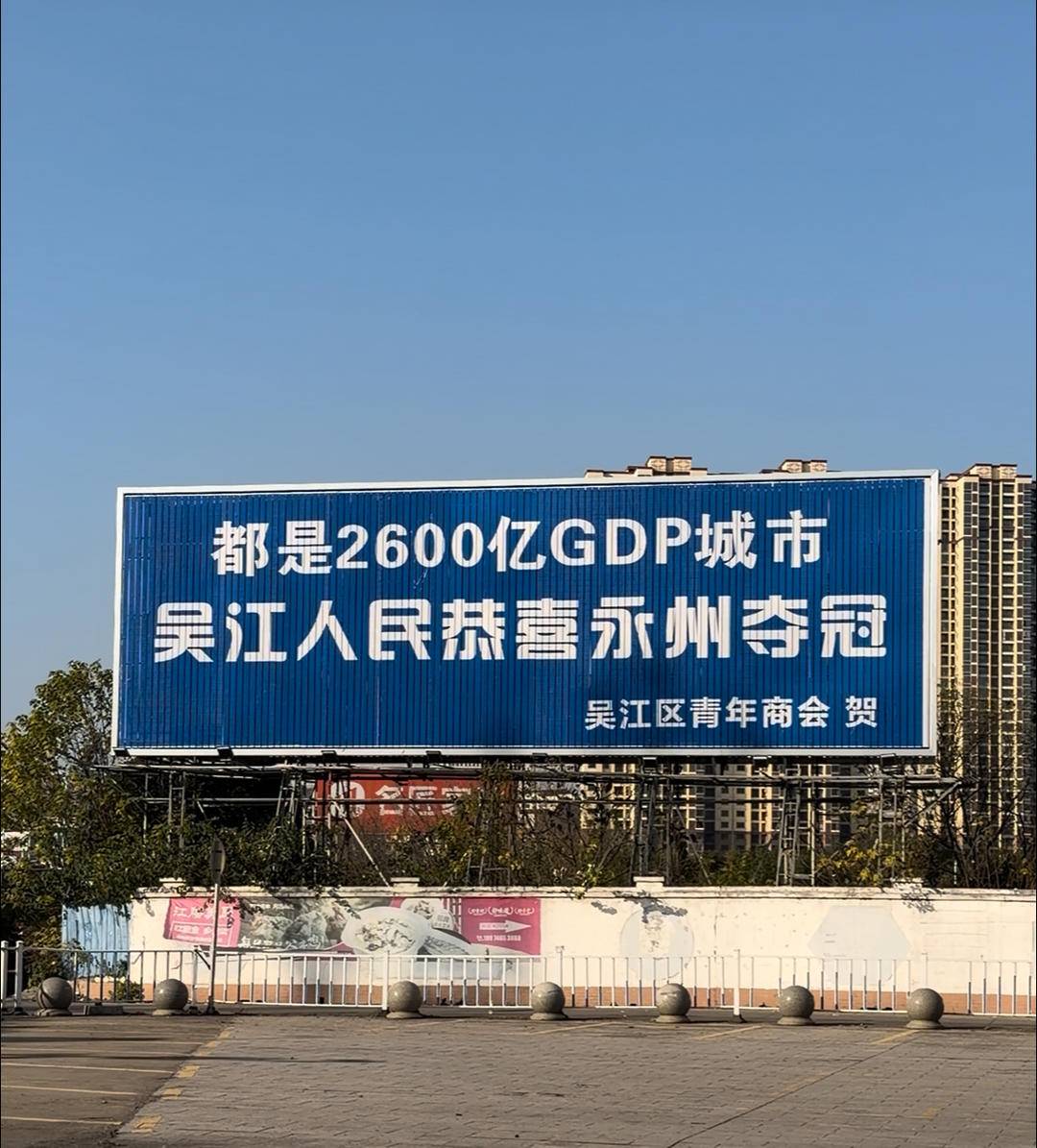 "都是2600亿GDP城市,吴江人民恭喜永州夺冠!"近日,在湖南永州潇湘大桥附近,一块醒目的巨幅广告牌悄然竖起,并迅速在网上掀起了一场关于"县 域经济领头羊"与"城市精神共鸣"的热烈讨论。 当江苏各地的祝贺牌以城市、乡镇甚至村庄的名义陆续出现在永州街头时,这块由吴江青年商会企业家陈忠慧自费投放的广告牌,却因为一个精准的数字 对比而显得尤为特别。1月9日,在接受扬子晚报/紫牛新闻记者采访时,陈忠慧表示:"这不只是对湘超冠军的诚挚祝贺,更想说一句——你的拼搏,吴江 的企业家们都懂。" 偶然的数据发现,催生"GDP梗"的道贺 "我们吴江人做事,要么不做,要做就做出点样子来!"电话那头,正在永州实地走访的陈忠慧坦言,"作为企业人,我本能地会想:怎么才能不一样?" 陈忠慧是吴江一家定制西服企业的创始人,也是一名退役军人。在构思贺词时,他首先想到了经济数据。"我知道吴江2024年的GDP大概是2600多亿,就 顺手查了一下永州——结果发现竟然也是2600多亿!"这个巧合让他眼前一亮。 "用GDP数据刺激眼球,可能是个不错的切入点。"陈忠慧说,"吴江本就是长三角经济腹地,讲经济是很自然的事。而永州和吴江虽然一个是地级市、一 ...