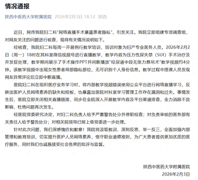 事件概述 - 陕西中医药大学附属医院妇二科在网络平台直播内部教学时暴露了女性患者隐私部位 引发公众关注 [1] - 医院为三级甲等中医医院 占地156亩 编制床位1800张 现有教职员工2800余名 [1] 事件经过与医院回应 - 事件发生于2026年2月2日18时 妇二科在其科室微信视频号进行例行教学直播 [1] - 直播教学内容为压力性尿失禁手术治疗及并发症处理 期间展示了手术操作PPT并播放了约4分钟的教学视频 [1] - 教学视频中出现了女性患者局部隐私部位 但无可识别个人身份信息 [1] - 授课人员在直播过程中发现网友异常评论后立即中断了直播 [1] - 医院核查后认定 此次事件是科室将内部教学视频错误使用公众平台进行网络直播所致 [2] 医院处理措施 - 医院立即关闭了相关直播链接 并在全院深入开展教学内容及平台渠道排查 [2] - 医院对妇二科负责人给予严重警告处分并停职检查 [2] - 医院对负责审核的医务部有关责任人给予警告处分 [2] - 相关院领导已报上级党委进一步处理 [2] - 医院表示将全面加强内部管理和教育培训 提升医护人员网络素养 [2]