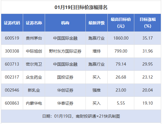 券商评级与目标价概览 - 1月19日,券商共发布6次上市公司目标价,按最新收盘价计算,目标价涨幅排名前三的公司为贵州茅台、中际旭创、密尔克卫,目标价涨幅分别为35.17%、31.96%、29.95% [1] - 贵州茅台获得中国国际金融“跑赢行业”评级,最高目标价为1860.00元 [2] - 中际旭创获得野村东方国际证券“增持”评级,最高目标价为799.00元 [2] - 密尔克卫获得中国国际金融“跑赢行业”评级,最高目标价为79.14元 [2] 获得券商推荐的上市公司 - 1月19日,共有17家上市公司获得券商推荐 [2] - 众生药业获得2家券商推荐,是当日获得推荐家数最多的公司 [2][3] - 内蒙华电、外服控股等公司均获得1家券商推荐 [2] 券商首次覆盖的公司 - 1月19日,券商共给出3次首次覆盖评级 [3] - 外服控股获得中银国际证券首次覆盖,给予“买入”评级 [3][4] - 千里科技获得东吴证券首次覆盖,给予“买入”评级 [3][4] - 众生药业获得国联民生证券首次覆盖,给予“推荐”评级 [3][4] 各公司所属行业 - 贵州茅台属于白酒行业 [1] - 中际旭创属于通信设备行业 [1] - 密尔克卫属于物流行业 [1] - 众生药业属于中药行业 [2][3] - 外服控股属于专业服务行业 [4] - 千里科技属于摩托车及其他行业 [4]