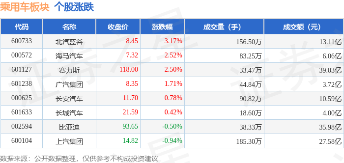 市场整体表现 - 2025年1月23日,上证指数上涨0.33%至4136.16点,深证成指上涨0.79%至14439.66点 [1] - 当日乘用车板块整体上涨0.49%,表现强于大盘 [1] - 乘用车板块整体呈现主力资金净流出11.47亿元,但游资与散户资金分别净流入4.29亿元和7.18亿元 [1] 个股价格与交易表现 - 北汽蓝谷领涨板块,股价上涨3.17%至8.45元,成交156.50万手,成交额13.11亿元 [1] - 海马汽车股价上涨2.52%至7.32元,成交83.25万手,成交额6.06亿元 [1] - 赛力斯股价上涨2.50%至118.00元,成交33.47万手,成交额39.03亿元 [1] - 广汽集团股价上涨1.71%至8.35元,成交44.84万手,成交额3.72亿元 [1] - 长安汽车股价上涨0.78%至11.70元,成交90.82万手,成交额10.59亿元 [1] - 长城汽车股价上涨0.42%至21.59元,成交18.60万手,成交额4.00亿元 [1] - 比亚迪股价下跌0.50%至93.65元,成交38.33万手,成交额35.98亿元 [1] - 上汽集团股价下跌0.94%至14.82元,成交185.30万手,成交额27.58亿元 [1] 个股资金流向分析 - 赛力斯获得主力资金净流入1.18亿元,主力净占比3.02%,但游资与散户资金分别净流出207.72万元和1.16亿元 [2] - 北汽蓝谷获得主力资金净流入1.08亿元,主力净占比8.26%,游资净流出1.43亿元,散户净流入3521.73万元 [2] - 长安汽车获得主力资金净流入4355.44万元,主力净占比4.11%,游资净流出6331.57万元,散户净流入1976.13万元 [2] - 海马汽车获得主力资金净流入2673.36万元,主力净占比4.41%,游资净流出1676.40万元,散户净流出996.96万元 [2] - 广汽集团获得主力资金净流入1837.53万元,主力净占比4.94%,游资净流入813.79万元,散户净流出2651.31万元 [2] - 长城汽车获得主力资金净流入1232.01万元,主力净占比3.08%,游资净流入2366.78万元,散户净流出3598.79万元 [2] - 比亚迪遭遇主力资金净流出6.86亿元,主力净占比-19.07%,但游资与散户资金分别净流入1.76亿元和5.10亿元 [2] - 上汽集团遭遇主力资金净流出7.88亿元,主力净占比-28.59%,但游资与散户资金分别净流入4.47亿元和3.42亿元 [2]
