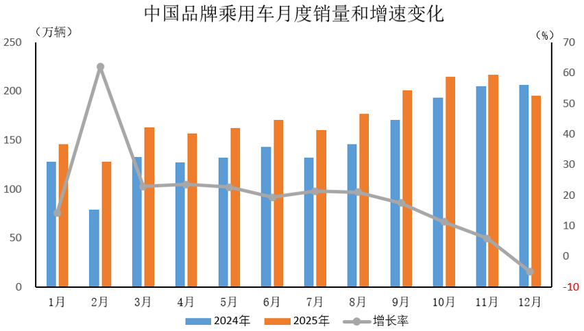 中汽协:2025年12月中国品牌乘用车共销售195.8万辆 环比下降9.7% 同比下降5.1%