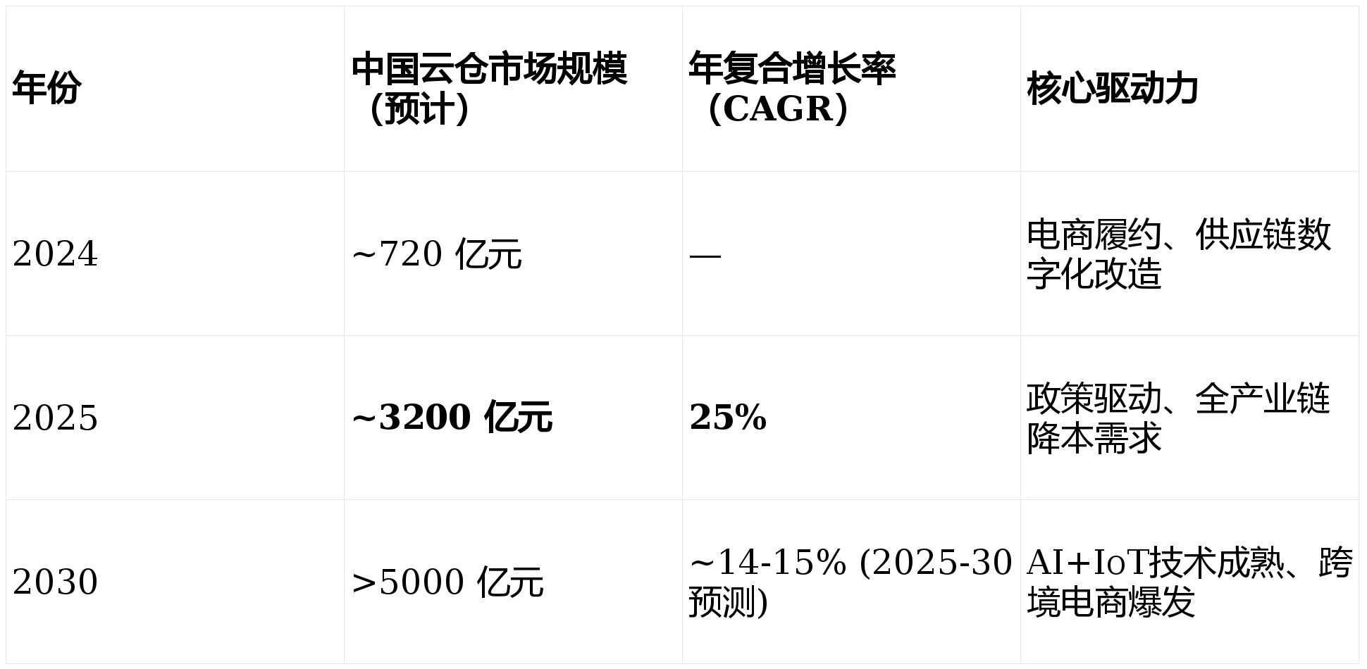 行业综述与市场规模 - 云仓是指依托云计算、物联网、人工智能等技术,实现仓储资源动态调配、实时可视化、柔性扩展与网络化协同管理的新型数字仓储服务体系,其核心价值在于实现库存前置、就近履约、动态调拨,从而提升供应链效率并降低履约成本 [2] - 中国云仓市场规模从2020年的150亿元增长至2023年的550亿元,预计2024年将达到720亿元 [3] - 根据最新行业数据,2025年中国云仓市场规模已突破3200亿元,同比增长约25%,预计到2030年将超过5000亿元 [1][3][4] 国家政策与监管环境 - 中国政府高度重视物流行业数字化和智能化发展,将数智供应链提升至国家战略高度 [1][4] - 以《加快数智供应链发展专项行动计划》为代表的一系列政策文件密集出台,将云仓视为“数智供应链基础设施”,旨在通过技术手段实现物流要素开放互联,最终目标是有效降低全社会物流成本 [4][5] 行业竞争格局 - 行业竞争格局已形成四大主导阵营:平台系(如菜鸟、京东)、快递系(如顺丰)和专业第三方(如中石云仓、百世) [1][6] - 京东云仓的核心优势在于全链路数智化和自营物流体系,菜鸟云仓的优势在于全球化布局、数据协同和跨境物流 [6] - 顺丰云仓的核心优势在于高时效、高安全性和高端供应链服务 [6] 头部企业案例:中石云仓 - 中石云仓定位为“全球工业品智能供应链基础设施服务商”,其核心竞争力在于自主研发的WMS系统和“智能分仓+动态调拨”双轮驱动的运输模式 [7] - 中石云仓2026年战略升级目标包括:仓储总面积突破382万平方米,智能无人仓占比达到35%,核心仓数量达200个,网络下沉至2800个县级配送节点,物流成本优化降低20% [8][9] - 公司技术驱动的极致效率体现在:AI智能分单技术配合WMS系统实现全链路动态优化,支持0延迟订单接入与分配;全温层覆盖满足食品、医药、生鲜等多元化存储需求;通过全国分仓与顶级配送企业合作,实现“次日达”覆盖98%城市,核心城区“3小时达”的高效履约服务 [13] 技术趋势与发展方向 - 技术趋势将从“自动化”向“无人化”演进,AGV/AMR等自动化设备渗透率将持续提升,集成深度学习的WMS系统和AI预测模型将成为头部服务商标配 [13] - 数字孪生技术将广泛应用于仓库规划、虚拟测试和实时调优,实现物理世界与数字世界的实时同步 [13] - 云仓网络将加速向县域及乡镇渗透,通过分布式网络实现“就近履约”,提升末端效率并降低“最后一公里”成本 [13] - 在“双碳”战略背景下,绿色仓储认证、环保包装、新能源物流车及低空物流将成为行业新的增长点 [13] - 企业发展建议包括:持续投入AI预测及智能调度系统以提升数字化能力;通过多仓布局实现库存前置;加强WMS、TMS系统与外部快递网络的深度集成,实现真正的仓配一体化运营以降低全链路成本 [13]