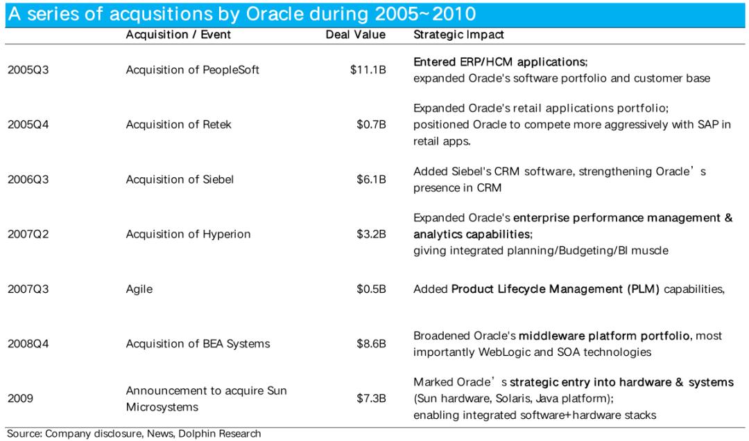 公司发展史与业务转型 - 公司成立于1977年,早期核心业务为关系型数据库管理系统,并成为美国数据库行业龙头 [1] - 1990年代至2009年,公司通过内部培育和一系列战略性收购实现业务多元化,进入企业管理软件领域,并在2009年通过收购Sun Microsystems进入硬件业务 [2][3][4] - 2010年至2015年为整合时代,公司致力于将硬件、基础软件和末端应用整合为垂直一体化解决方案 [4] - 云转型初期效果不佳,2012年才开始SaaS化转型,2016年推出从头构建的Oracle Cloud Infrastructure,但到2022财年,整体云业务营收仅占总收入的25%,OCI仅占约7% [5][6][7] - 2023年起,在AI浪潮推动下,OCI业务进入高速增长期,并于2025年9月宣布与OpenAI等客户签订价值约3000亿美元的大额订单,成为AI云服务关键公司 [7][8] 当前业务与收入构成 - 自2026财年起,公司调整收入披露为四大板块:云业务、软件、硬件、服务 [10] - **云业务**是当前最重要且增长最快的板块,可细分为IaaS类的OCI和SaaS类的OCA,近期OCI增速反超并已在云板块内占据更高比例 [11][12][13] - **软件**业务包括一次性许可销售收入和持续性支持收入,曾是最大收入板块,现已被云业务反超,收入占比降至不足40% [14] - **硬件**业务包括服务器销售及维护支持,收入占比已萎缩至约5% [15] - **服务**业务主要包括咨询服务和其他定制服务,收入占比为高个位数百分比 [15] - 自2018财年以来,非云传统业务增长基本停滞,公司总营收增长完全依赖云业务,尤其是OCI业务驱动 [19][20] 3000亿美元大单的意义与来源 - 公司在F1Q26财报会上宣布新签订价值约3000多亿美元的云服务需求合约,相当于其2025财年总营收的5.8倍 [25] - 公司提供了直至2030财年的业绩指引:总营收预计从2025财年的约570亿美元增长至2030财年的2250亿美元,5年复合增长率达31%;OCI营收预计从2025财年的约100亿美元增长至2030财年的1660亿美元,5年增长约16倍 [25] - 市场共识认为,这3000多亿美元订单绝大部分来自OpenAI单一客户,合同内容为从2027自然年开始,每年约600亿美元,为期5年 [31][32] - 根据剩余履约义务分析,现有合同能完全覆盖2026至2028财年的OCI预期收入,但2029财年之后仍有约1100亿美元的订单缺口需要填补 [28] 与OpenAI合作的得与失及豪赌动机 - 公司接替微软,成为OpenAI最主要的云服务合作伙伴,不仅提供算力,也借助OpenAI的技术能力弥补自身在大模型研发上的短板 [34] - 合作带来了巨大的收入增长机遇,但也使公司面临客户高度集中的风险,来自OpenAI的合约占公司当前总剩余履约义务的约58% [37] - 公司的技术附加值和议价能力被认为相对传统云巨头较低,其AI云业务以BareMetal模式为主,毛利率承压,公司官方指引AI云毛利率在30%至40%之间 [37][38] - 为满足算力需求,公司资本开支压力巨大,2026财年总资本开支预计翻倍至500亿美元,相当于预期总收入的75% [39] - 公司长期采取举债经营策略,净负债已是股东权益的近3倍,而资本开支和发债的高峰期尚未到来,存在潜在的资产负债表风险 [39][40] - 对Oracle而言,OCI业务成功与否关乎公司存亡,是其从增长停滞的传统软件公司转型的关键,因此甘愿承担与OpenAI合作带来的巨大风险和资本投入 [45]