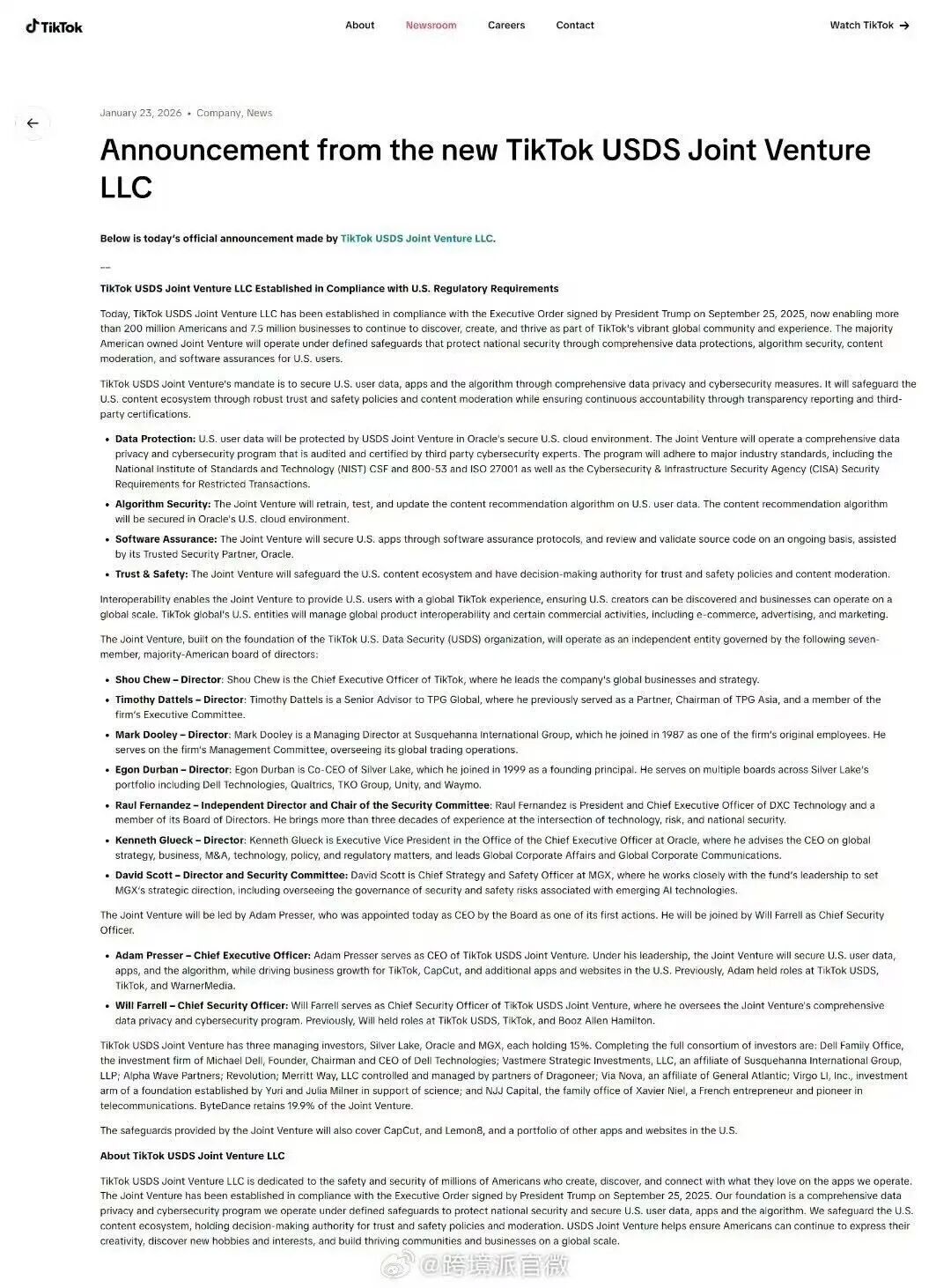 TikTok美国数据安全合资公司成立 - 公司于北京时间1月23日宣布成立TikTok美国数据安全合资有限责任公司,以全面负责TikTok美国的数据保护、算法安全、内容审核及软件保障[1] - 该合资公司的成立旨在遵守2025年9月25日签署的行政命令,使超过2亿美国用户和750万美国企业能够继续使用TikTok[4] - 此举标志着始于2019年的跨国博弈暂时告一段落,核心安排是“算法在字节,安全在美国”[1][2] 合资公司治理与股权结构 - 合资公司将作为独立实体运营,由一个七人董事会管理,其中美国籍成员占多数,TikTok CEO周受资在列[4][7] - 合资公司由首席执行官亚当·普雷瑟和首席安全官威尔·法雷尔共同领导,二人此前均在TikTok USDS任职[2][5][8] - 在股权层面,一个投资财团持有约50%股权,其中科技公司甲骨文、私募股权公司银湖资本和阿联酋支持的投资公司MGX各持股15%[5][9] - 字节跳动保留19.9%的股份,为合资公司最大单一股东,实现不控股但保留关键影响力[5][9][10] 核心业务与权责划分 - 合资公司的核心职责是保护美国用户数据、算法安全、内容审核及软件保障,其安全措施也将覆盖CapCut、Lemon8等在美国运营的其他应用和网站[4][6] - 字节跳动继续拥有TikTok算法的知识产权,并以授权方式向合资公司开放使用,算法本身的知识产权未让渡[1][11] - 为确保产品体验一致性,字节跳动全资控股的TikTok美国实体将继续管理全球产品互联互通以及电商、广告和营销等核心商业化活动[4][12] - 自2026年1月22日起,相关商业合同关系将转移至字节跳动新成立的美国子公司TT Commerce & Global Services,但用户和广告主的体验与业务功能保持不变[19][20] 数据与算法安全的具体措施 - 美国用户数据将受到保护,存储在甲骨文安全的美国云环境中,并运行一个由第三方网络安全专家审计和认证的全面数据隐私与网络安全计划[8] - 内容推荐算法将在甲骨文的美国云环境中进行保护,并由合资公司使用美国用户数据进行重新训练、测试和更新[8] - 软件将通过软件保证协议进行保护,并由其可信安全合作伙伴甲骨文协助持续审查和验证源代码[8] - 合资公司将维护美国内容生态系统,并对信任与安全政策及内容审核拥有决策权[4][8] 对字节跳动的意义与影响 - 第一,算法主权未失,TikTok最核心的推荐机制仍然是公司体系内的资产[15] - 第二,全球网络不断裂,产品与社区仍是一个整体,美国用户未被切割成“孤岛”[16] - 第三,现金流在手,电商、广告、市场运营等核心商业化业务仍由公司负责,收入结构未被抽空[17] - 对普通用户和广告主而言,此次交易几乎无感,美国用户体验和广告主业务不会发生变化[18] 对跨境电商行业的影响 - TikTok Shop截至2025年拥有约4亿活跃消费者,平台商品交易总额接近千亿美元,在全球电商平台中排名第五但增速第一[26] - 合资公司成立后,针对TikTok的禁令风险阶段性解除,政策不确定性显著下降,为北美市场的长期经营奠定了基础[27] - 规则将收紧,美国侧将采用更严格的合规标准进行算法安全与内容审核,擦边内容、夸大宣传等行为将更容易被识别和限流[29][30] - 流量分配可能更偏向本土合规内容与品牌型卖家,对资金、供应链、合规能力强的卖家是“洗牌式利好”,但对依赖粗放打法的中小卖家压力增大[30] - 行业野蛮生长的窗口正在关闭,进入筛选时代,考验卖家在算法由字节控制、监管已落地的体系下的长期生存能力[31][32]