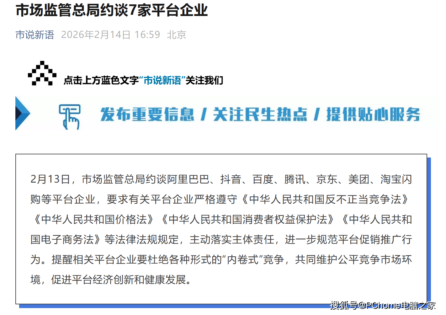 监管动态 - 市场监管总局于2月13日约谈了阿里巴巴、抖音、百度、腾讯、京东、美团、淘宝闪购等多家主要平台企业 [1] - 监管要求平台企业严格遵守《反不正当竞争法》《价格法》《消费者权益保护法》《电子商务法》等法律法规 [1] - 监管要求平台企业主动落实主体责任,进一步规范平台促销推广行为 [1] 监管要求与行业导向 - 监管提醒相关平台企业要杜绝各种形式的“内卷式”竞争 [1] - 监管旨在共同维护公平竞争市场环境 [1] - 监管的最终目标是促进平台经济创新和健康发展 [1]