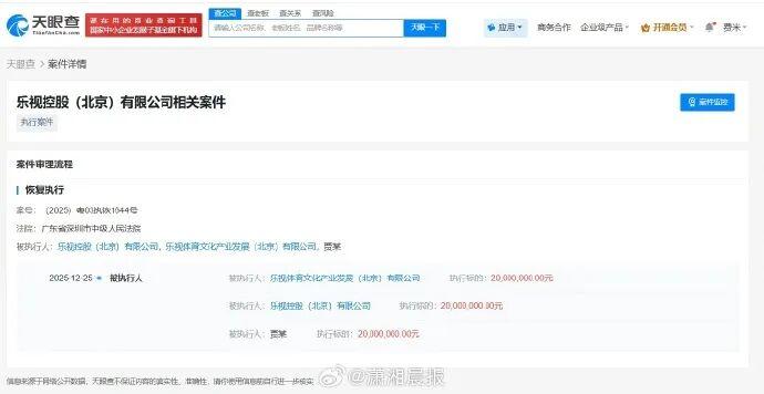 12月31日,记者查询天眼查法律诉讼信息显示,近日,乐视体育文化产业发展(北京)有限公司、乐视 控股(北京)有限公司、贾跃亭新增一则恢复执行信息,执行标的2000万元人民币,执行法院为广东省 深圳市中级人民法院。 乐视控股(北京)有限公司成立于2011年9月,法定代表人为吴孟,注册资本10亿元人民币,经营范围 包括项目投资、投资管理、资产管理、投资咨询等,由贾跃亭、汇鑫资产管理(天津)合伙企业(有限 合伙)等共同持股,其中贾跃亭持股比例约92%。据媒体报道,此前,贾跃亭发布年终总结及未来规划 时表示,其将继续还债、继续造车。 乐视网成立于2004年11月,法定代表人为刘延峰,注册资本约39亿余元,业务范围广泛,涵盖汽车新车 销售、互联网信息服务、第二类增值电信业务、广播电视节目制作经营、网络文化经营等多个领域。公 司股东包括贾跃亭等。 回顾乐视网的发展历程,其曾在互联网视频领域占据重要地位,在影视内容、智能终端等方面积极布 局,推出过乐视手机等产品。2010年8月12日,乐视网在中国创业板上市,成为全球第一家IPO上市的 视频网站,市值一度从上市之初的30亿元增长至1700多亿元,堪称创业板市值最高的公司。 ...