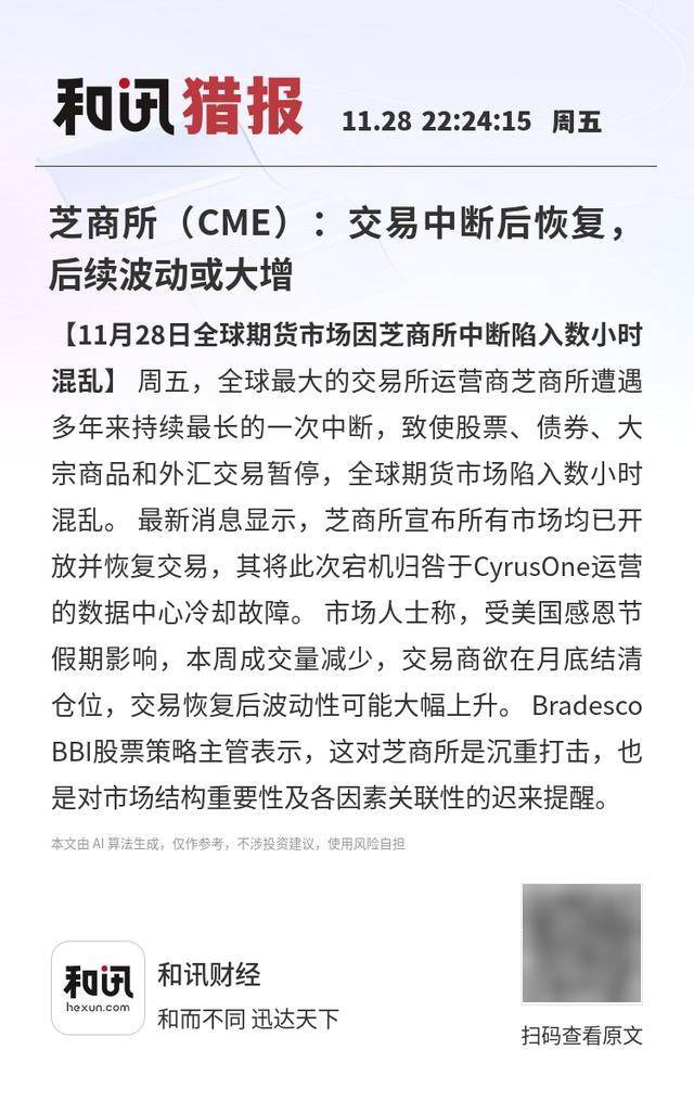 【11月28日全球期货市场因芝商所中断陷入数小时混乱】周五,全球最大的交易所运营商芝商所遭遇多 年来持续最长的一次中断,致使股票、债券、大宗商品和外汇交易暂停,全球期货市场陷入数小时混 乱。最新消息显示,芝商所宣布所有市场均已开放并恢复交易,其将此次宕机归咎于CyrusOne运营的 数据中心冷却故障。市场人士称,受美国感恩节假期影响,本周成交量减少,交易商欲在月底结清仓 位,交易恢复后波动性可能大幅上升。Bradesco BBI股票策略主管表示,这对芝商所是沉重打击,也是 对市场结构重要性及各因素关联性的迟来提醒。 本文由 AI算法生成,仅作参考,不涉投资建议,使用风险自担 和讯猎报 11.28 22:24:15 周五 本文由 Al 算法生成,仅作参考,不涉投资建议,使用风险自担 和讯财经 和而不同 迅达天下 扫码查看原文 芝商所(CME):交易中断后恢复, 后续波动或大增 【11月28日全球期货市场因芝商所中断陷入数小时 混乱】周五,全球最大的交易所运营商芝商所遭遇 多年来持续最长的一次中断,致使股票、债券、大 宗商品和外汇交易暂停,全球期货市场陷入数小时 混乱。最新消息显示,芝商所宣布所有市场均已开 放并 ...