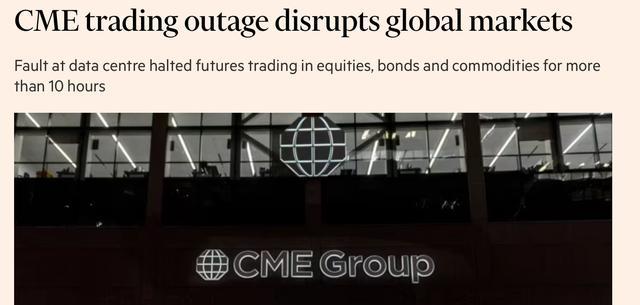 (图片来源:Financial Times) 作为提供利率、股票、金属、能源、加密货币及农产品等广泛基准产品的交易所,芝商所的系统稳定性 对全球金融市场具有重要影响。此次故障波及多个交易平台,包括外汇交易平台EBS,欧元对美元、美 元对日元等主要货币汇率报价一度停止更新。对于部分交易员而言,若中断时间持续,可能带来显著不 便,例如需将头寸在不同合约月份间转移。 来源:环球网 【环球网财经综合报道】据Financial Times等外媒报道,当地时间周四深夜,全球市值最大的交易所运 营商芝加哥商品交易所集团(CME Group)发布公告称,因CyrusOne数据中心冷却系统出现故障,旗 下衍生品市场暂停交易。芝商所表示,技术支持部门正努力在短期内解决问题,并将尽快向客户提供开 盘前的详细信息。CyrusOne总部位于美国达拉斯,在美国、欧洲和日本运营着超过55个数据中心。 这并非芝商所首次因技术问题被迫暂停电子交易。2014年,其Globex电子系统曾因技术故障导致部分农 产品合约电子交易关闭;2019年也曾发生类似长时间系统中断。此次故障持续时间已超过2019年那次事 件。CME于当地时间周四深夜通过社交媒体 ...