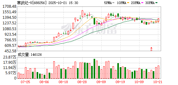 数据显示,富安达基金旗下1只基金重仓寒武纪。富安达优势成长混合A(710001)二季度持有股数4.75 万股,占基金净值比例为4.76%,位居第五大重仓股。根据测算,今日浮盈赚取约328.1万元。 富安达优势成长混合A(710001)成立日期2011年9月21日,最新规模6亿。今年以来收益61.86%,同类 排名396/8160;近一年收益54.57%,同类排名567/8026;成立以来收益351.08%。 富安达优势成长混合A(710001)基金经理为申坤。 10月22日,寒武纪涨5.04%,截至发稿,报1438.00元/股,成交163.78亿元,换手率2.80%,总市值 6063.83亿元。 资料显示,中科寒武纪科技股份有限公司位于北京市海淀区知春路7号致真大厦D座5层、11-13层、16 层,成立日期2016年3月15日,上市日期2020年7月20日,公司主营业务涉及各类云服务器、边缘计算设 备、终端设备中人工智能核心芯片的研发、设计和销售。主营业务收入构成为:云端产品线99.62%, 其他(补充)0.32%,边缘产品线0.05%,IP授权及软件0.00%。 从基金十大重仓股角度 截至发稿,申坤累计任职 ...