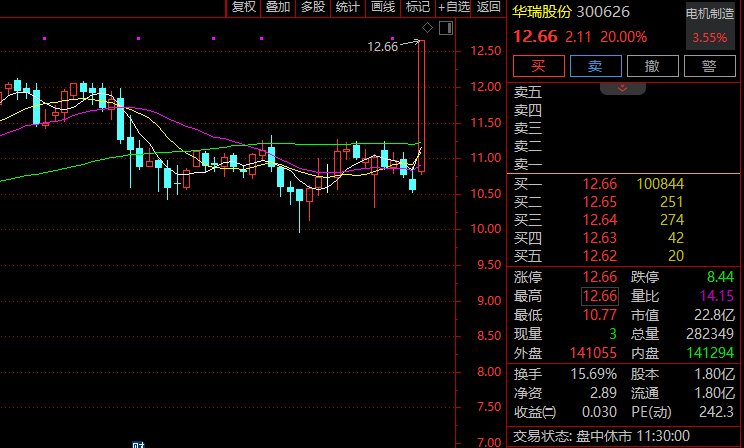 今日早盘,A股全线高开高走,科技成长股领涨,创业板指最高涨逾3%,收复3000点大关,科创50盘中 亦一度涨逾2%,逼近1400点。超4200只个股上涨,成交保持平稳。盘面上,人形机器人、芯片、消费电 子、航天装备等板块涨幅居前,贵金属、医疗美容、养殖业、电信服务等板块跌幅居前。 人形机器人再现亿元大单 人形机器人产业链早间全线走强,电机制造方向领涨,板块指数盘中放量大涨逾4%。华瑞股份20%涨 停,创年内新高,大洋电机高开后直线拉升,不到10分钟也快速封板,鸣志电器、星德胜、康平科技等涨 幅居前。 | | 复权 叠加 多股 | 统计 画 | 标记 +自选 返回 | | | 华瑞股份 300626 | | 电机制造 | | --- | --- | --- | --- | --- | --- | --- | --- | --- | | | | 12.66 | | 12.50 | | 12.66 2.11 20.00% | | 3.55% | | | | | | 12.00 | 买 | 卖 | 撤 | 部 | | | | | | 11.50 | | | | | | | | | | 11.00 | | | | | ...