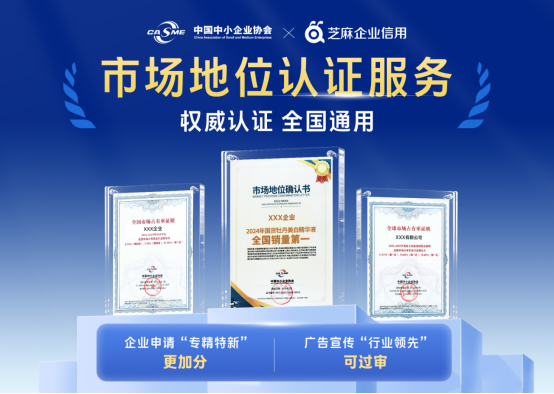 中国中小企业协会联合芝麻企业信用推出“市场地位认证服务”,为企业提供权威“实力身份证”