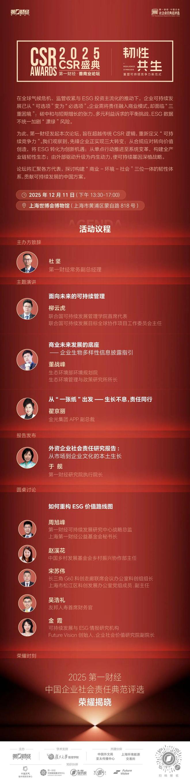 活动核心背景与驱动力 - 企业可持续发展正从“可选项”转变为“必选项”,受全球气候危机、监管政策收紧及ESG投资主流化三重驱动 [1] - 企业实践面临“三重困境”:环境上碳中和与短期增长存在张力、社会层面多元利益相关方诉求难平衡、治理端ESG数据与标准不统一加剧“漂绿”风险 [1] - 先锋企业正经历三大关键转变:从合规应对转向价值创造、从单点行动推进至系统变革、由外部驱动升级为内生动力 [1] 论坛核心议题与目标 - 论坛旨在超越传统企业社会责任逻辑,重新定义“可持续竞争力” [1] - 共同探讨如何打造“商业-环境-社会”三位一体的韧性体系,推动企业价值与社会价值共生进化 [1] 主要演讲与发布内容 - 主题演讲涵盖面向未来的可持续管理及商业未来发展的底座 [5] - 发布企业生物多样性信息披露指引及外资企业社会责任研究报告,关注企业文化本土生长 [5] - 圆桌讨论主题为如何重构ESG价值路线图 [6] 参与机构与评选活动 - 论坛汇聚监管、企业、学界与投资界代表,包括联合国机构、生态环境部研究机构、知名企业及高校 [5][6] - 设置“2025第一财经中国企业社会责任典范评选”荣耀揭晓环节 [6]