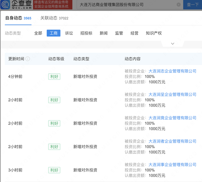 | | 全国企业信用查询系统 | 有远见的商业传奇 | | | 大连万达商业管理集团股份有限公司 | | 8 晋一下 | | --- | --- | --- | --- | --- | --- | --- | --- | | 自身动态 3565 | 关联动态 37022 | | | | | | | | 动态类型 | 全部 | 工商 | 诉讼 | 招投标 | 新闻 | 监管 | 经营 知识产权 | | 更新时间(1) | | 动态等级 | | 动态类型 | | | 动态内容 | | 4分钟前 | | 利好 | | 新增对外投资 | | | 被投资企业:大连润志企业管理有限公司 投资比例:100% | | | | | | | | | 认缴出资额:1000万元 | | 2小时前 | | 利好 | | 新增对外投资 | | | 被投资企业:大连润呈企业管理有限公司 投资比例:100% | | | | | | | | | 认缴出资额:1000万元 | | 2小时前 | | 利好 | | 新增对外投资 | | | 被投资企业:大连润竟企业管理有限公司 投资比例:100% | | | | | | | | | 认缴出资额:1 ...