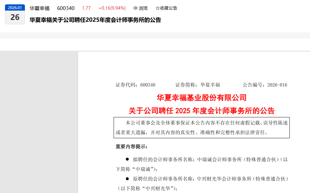 拟聘任的会计师事务所名称:中瑞诚会计师事务所(特殊普通合伙)(以下简称"中瑞诚"); 原聘任的会计师事务所名称:中兴财光华会计师事务所(特殊普通合伙)(以下简称"中兴财光华"); 审计收费基于会计师事务所专业服务所承担的责任和需投入专业技术的程度,综合考虑参与工作员工的经验和级别相应的收费率以及投入的 工作时间等因素定价,公司拟定本年度财务报表审计费338.00万元,内部控制审计费94.50万元,合计432.50万元,与上一年审计服务费用一 致。 证券代码:600340 证券简称:华夏幸福 公告编号:2026-016 华夏幸福基业股份有限公司 关于公司聘任2025年度会计师事务所的公告 重要内容提示: - 拟聘任的会计师事务所名称:中瑞诚会计师事务所(特殊普通合伙)(以下简称"中瑞诚"); - 原聘任的会计师事务所名称:中兴财光华会计师事务所(特殊普通合伙)(以下简称"中兴财光华"); - 变更会计师事务所的简要原因及前任会计师的异议情况:鉴于华夏幸福基业股份有限公司(以下简称"公司")原聘任的会计师事务所中兴财 光华因个别审计业务已被中国证券监督管理委员会立案调查,为保障公司2025年度审计工作顺利开展,经 ...