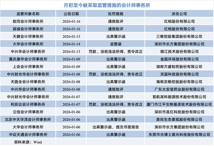 文章核心观点 - 2026年初监管机构对会计师事务所的集中处罚并非孤例,而是财务造假综合惩防工作常态化、监管从事后处置转向事前预防和事中监控的体现,旨在以“零容忍”姿态进行全链条治理,倒逼中介机构回归“看门人”角色 [2][12][13] 监管处罚概况 - 2026年开年仅半个多月,已有16家会计师事务所被采取监管措施 [1][11] - 处罚措施包括通报批评、出具警示函、罚款、没收违法所得、责令改正等 [12] - 多家会计师事务所被罚均与其A股客户公司的财务造假相关 [1] 具体处罚案例:红相股份及相关会计师事务所 - 红相股份在2017年至2022年间累计虚增收入约10.01亿元,累计虚增利润总额3.92亿元,部分年份再融资存在欺诈发行 [3] - 公司及相关责任人被合计罚款6556万元,时任董事长兼总经理被采取终身市场禁入措施 [3] - 致同会计师事务所为红相股份出具2017年至2018年年审报告,容诚会计师事务所出具2019年至2021年年审报告,上述报告均存在虚假记载 [1][4] - 深交所对致同所、容诚所及5名签字注册会计师予以通报批评 [1][4] 具体处罚案例:太安堂及相关会计师事务所 - 太安堂在2018年至2021年累计虚增利润4.29亿元,且未按规定披露关联交易 [7] - 公司及相关责任人被合计罚款1370万元,并于2024年7月初因面值退市情形摘牌 [6][7] - 中兴华会计师事务所在太安堂2018年至2020年年报审计中未勤勉尽责,出具含有虚假记载的审计报告,被深交所通报批评 [5] 具体处罚案例:其他公司及相关会计师事务所 - 江平生物在2021年、2022年年报中累计虚增营收2.99亿元,累计虚增利润总额1.16亿元,相关股票定向发行说明书存在虚假记载 [8] - 公司及相关责任人被合计罚款1260万元 [8] - 利安达会计师事务所为其出具的2021年、2022年年审报告存在虚假记载,被罚没共计约92万元,3名注册会计师被合计罚款78万元 [8] - 京蓝科技2020年年报虚增收入1.63亿元,虚增利润总额6636.37万元,公司及相关责任人被合计罚款1050万元 [8][9] - 中兴财光华为其出具的2020年、2021年年审报告存在虚假记载,被罚没合计约218万元,3名签字注册会计师被合计罚款80万元 [8] 监管趋势与行业影响 - 监管层正完善制度保障,推动法律法规出台,增强行政、刑事、民事协同,对财务造假和第三方配合造假进行一体打击 [12] - 监管逻辑已从事后“灭火”转向事前预防、事中监控 [2] - 对会计师事务所的集中处罚旨在倒逼中介机构回归“看门人”角色,要求其将资源投入实质性质量管控 [13][14] - 对“配合造假者”的同步追责是斩断财务造假利益链、瓦解造假生态圈的关键 [15] - 建议对第三方中介机构配合造假的惩处采取“资格罚”与“经济罚”并重、“行政、民事、刑事”三责并举的原则 [16]