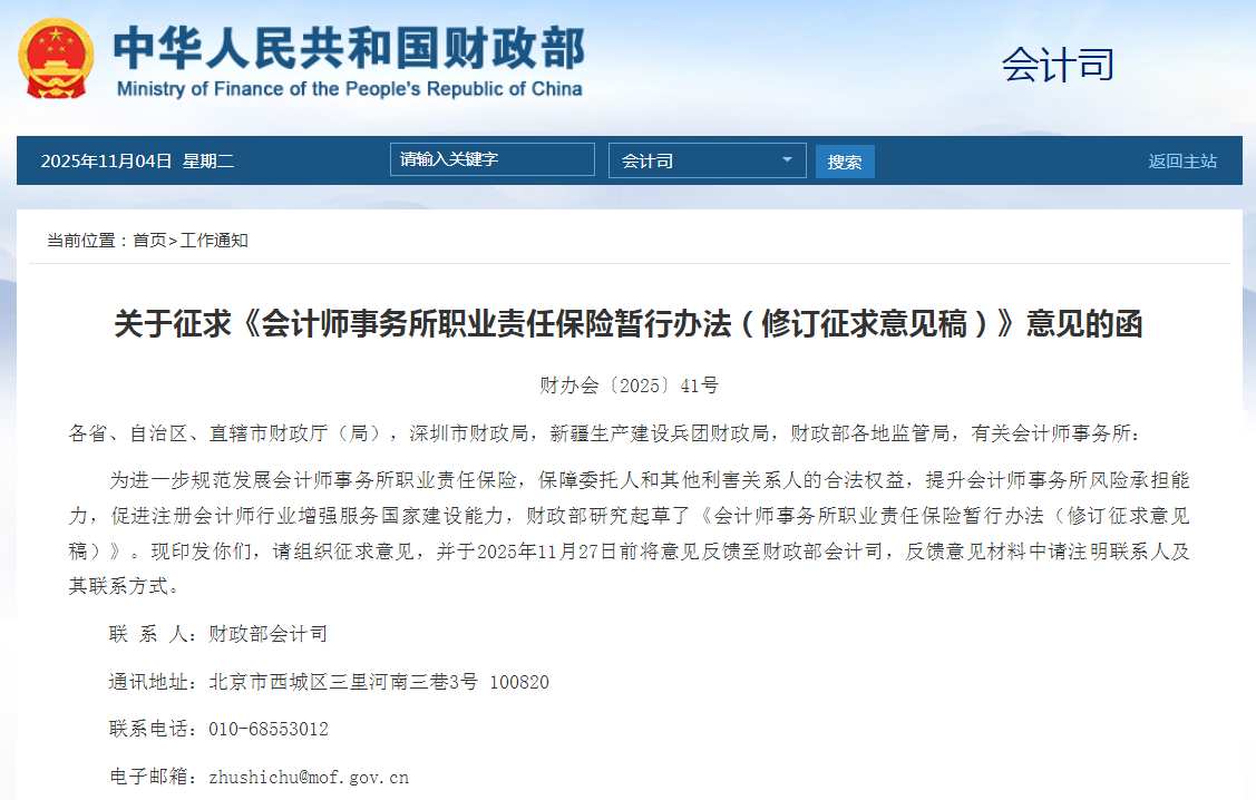 财政部表示,有必要结合实践经验,研究修订保险办法,坚持市场化、法治化规范发展会计师事务所职 业责任保险,充分发挥责任保险险种优势,规范会计师事务所投保和保险公司理赔等行为,完善会计师 事务所审计风险防范和承担机制,保障委托人和其他利害关系人的合法权益,促进注册会计师行业增强 服务国家建设能力。(完) 来源:中国新闻网 编辑:郭晋嘉 广告等商务合作,请点击这里 《会计师事务所职业责任保险暂行办法(修订征求意见稿)》公布 中新网北京11月4日电 (记者 赵建华)财政部研究起草了《会计师事务所职业责任保险暂行办法(修订征求 意见稿)》,目前正向社会公开征求意见。 修订征求意见稿分为五章24条,包括:第一章为总则,共3条;第二章为投保与承保,共11条;第三章 为理赔,共3条;第四章为监督管理,共4条;第五章为附则,共3条。 修订征求意见稿聚焦风险领域,分类设定要求。对依法备案从事证券服务业务以及从事金融企业等涉及 公众利益相关实体审计业务的会计师事务所,提出更高的累计赔偿限额投保要求,以提升从事特定业务 会计师事务所的职业责任风险承担能力、更好维护投资者等各方利益。 修订征求意见稿优化费率机制,体现"奖优罚劣"。细化 ...